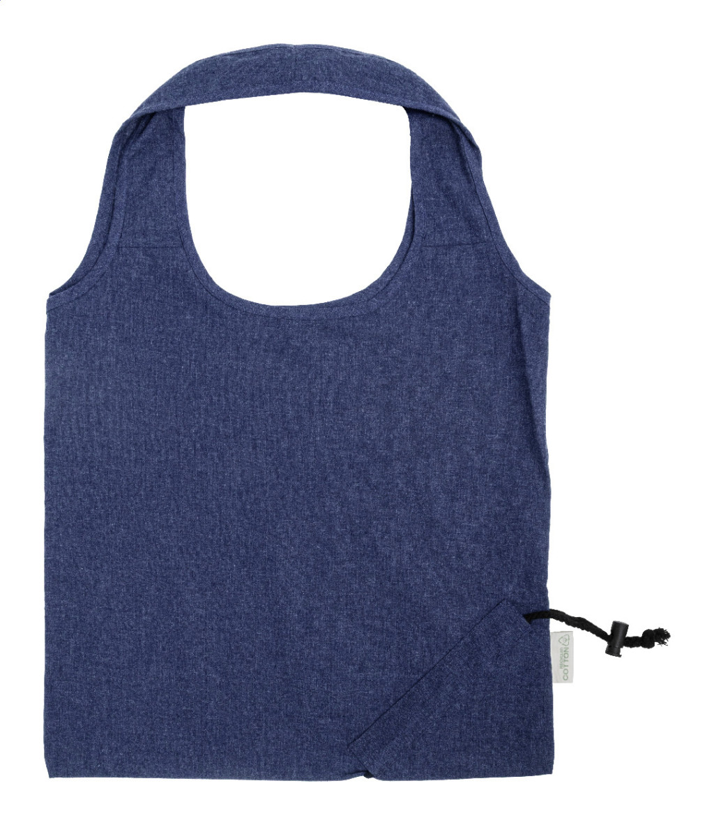 Összehajtható bevásárlótáska 70% újrahasznosított pamutból és 30% RPET poliészterből, 140 g/m². Megkülönböztető újrahasznosított pamut címkével.