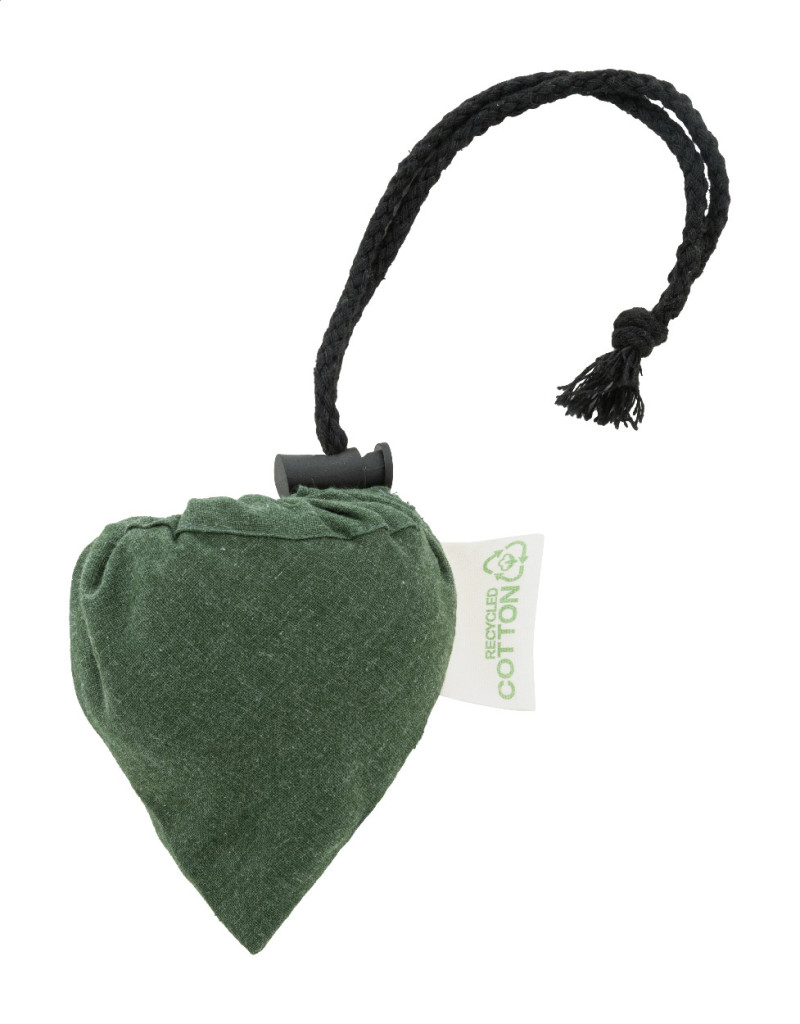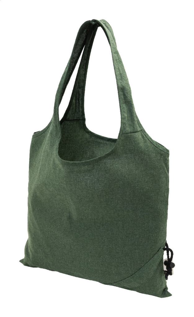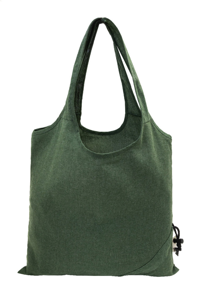 Összehajtható bevásárlótáska 70% újrahasznosított pamutból és 30% RPET poliészterből, 140 g/m². Megkülönböztető újrahasznosított pamut címkével.