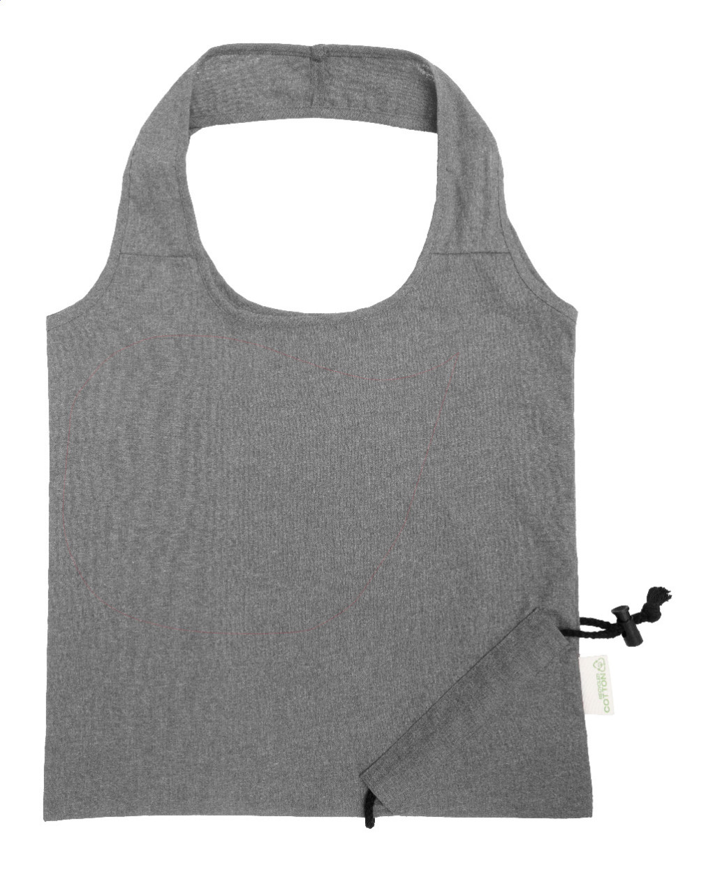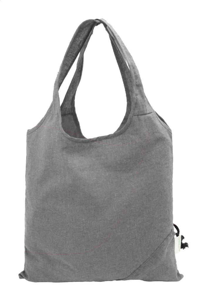Összehajtható bevásárlótáska 70% újrahasznosított pamutból és 30% RPET poliészterből, 140 g/m². Megkülönböztető újrahasznosított pamut címkével.
