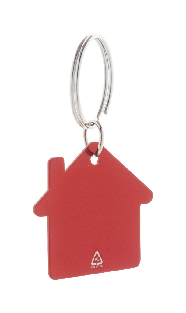 Ház alakú, újrahasznosított alumínium kulcstartó fém karikával.
