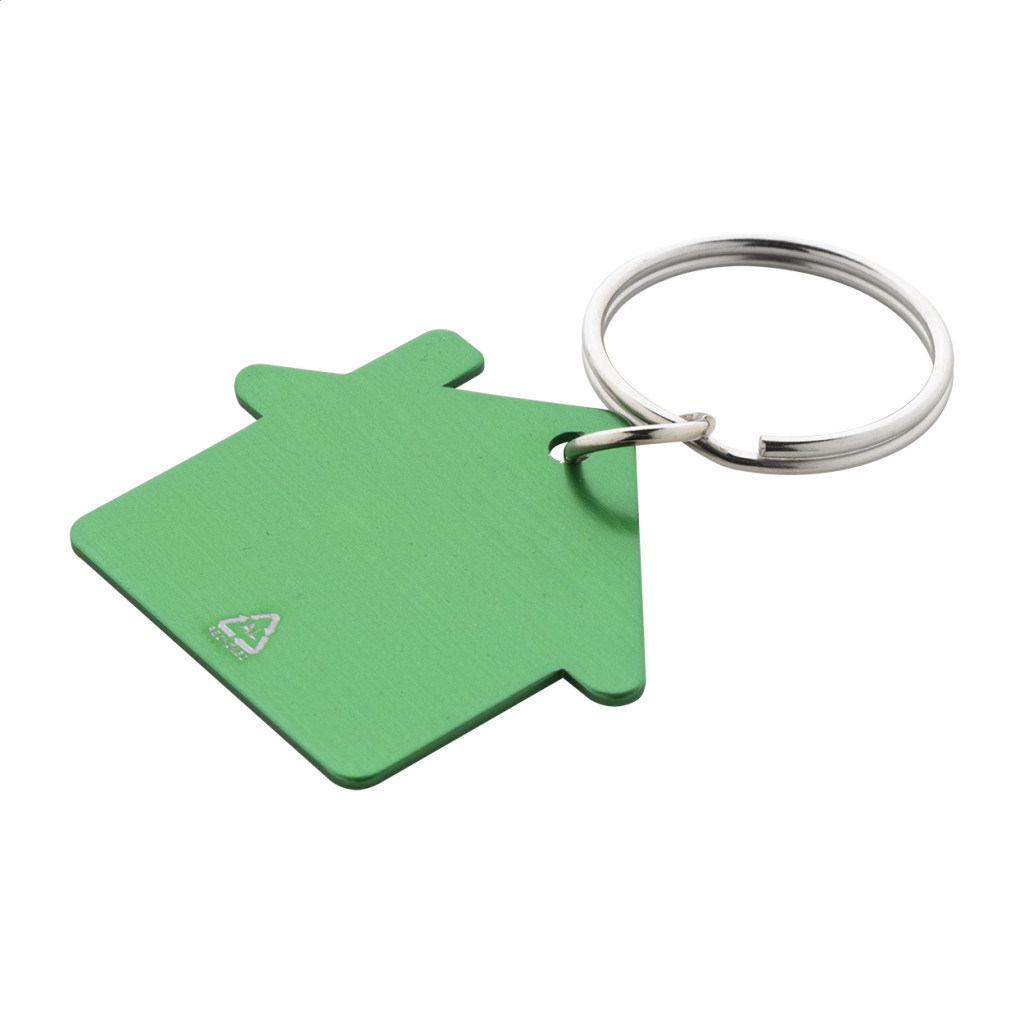 Ház alakú, újrahasznosított alumínium kulcstartó fém karikával.