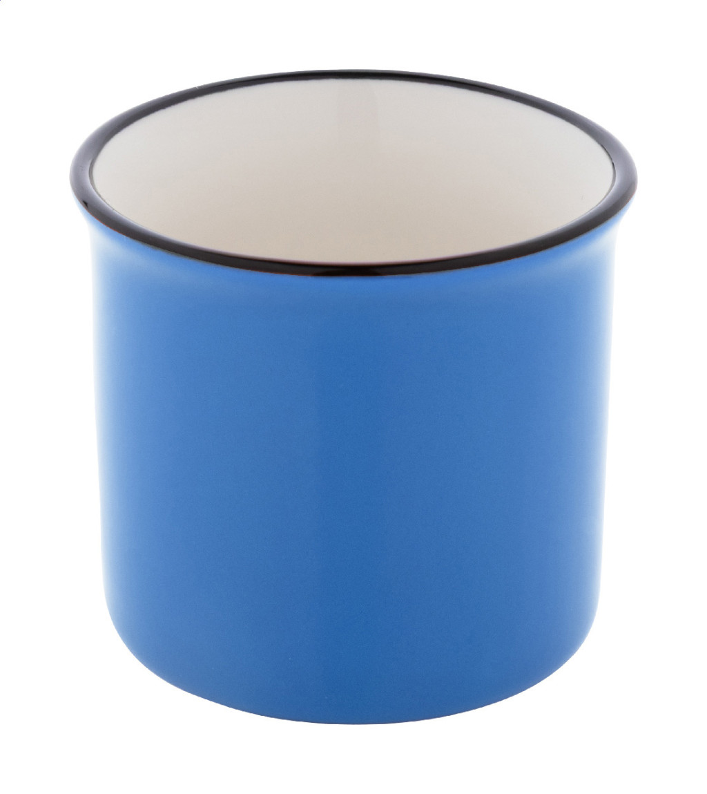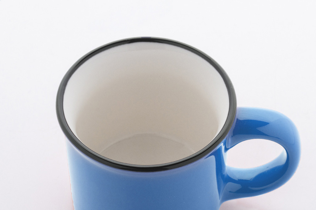 Mini vintage kerámia bögre fekete peremmel, belül fehér kívül színes bevonattal, 90 ml. Kraft papír dobozban.