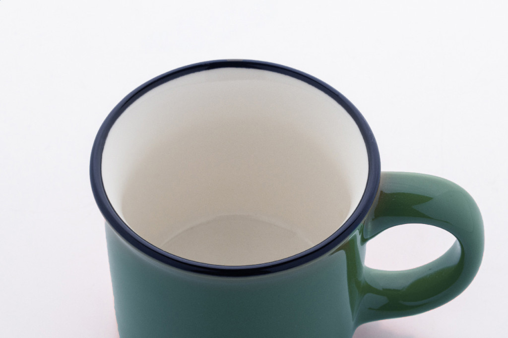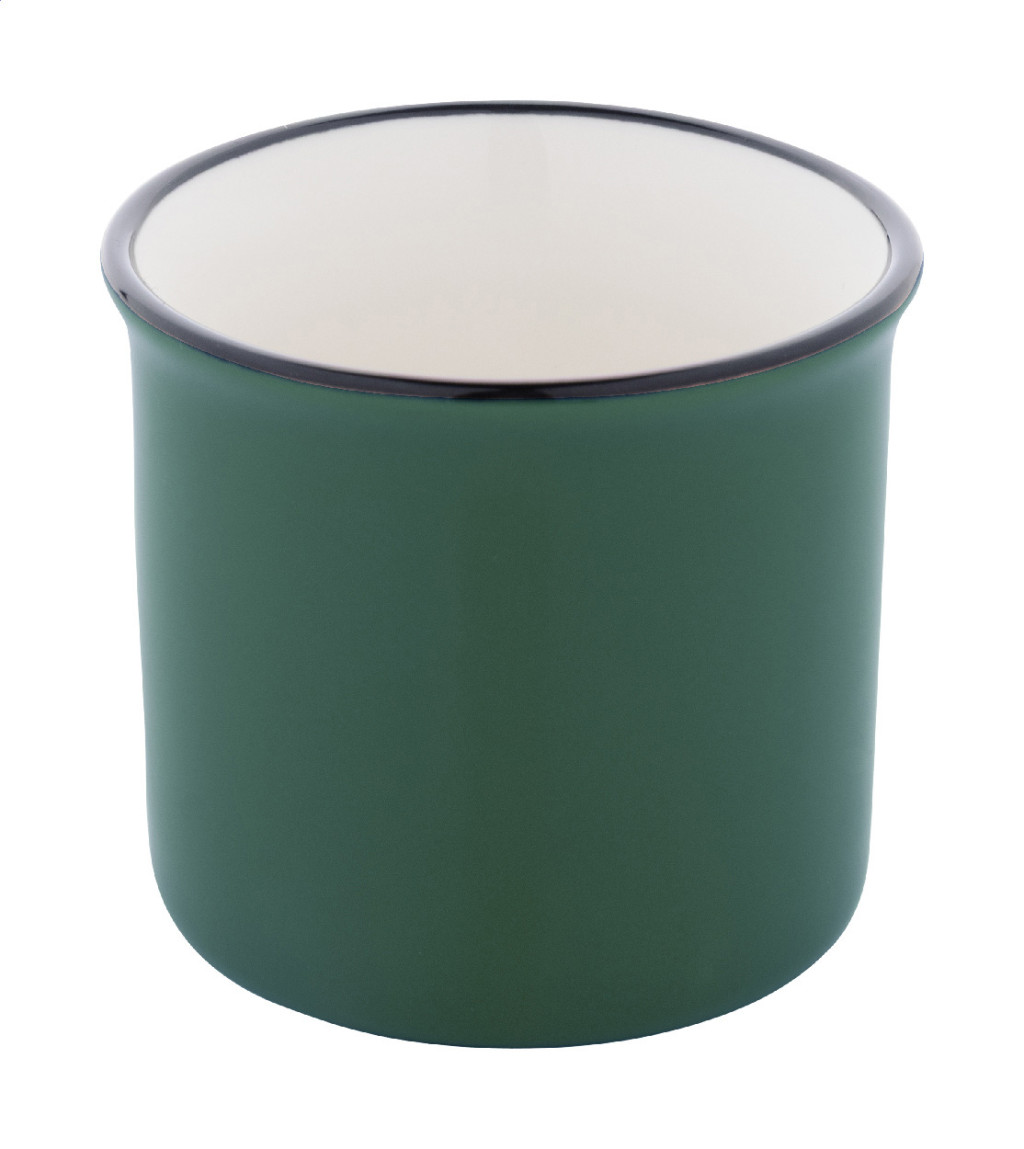 Mini vintage kerámia bögre fekete peremmel, belül fehér kívül színes bevonattal, 90 ml. Kraft papír dobozban.