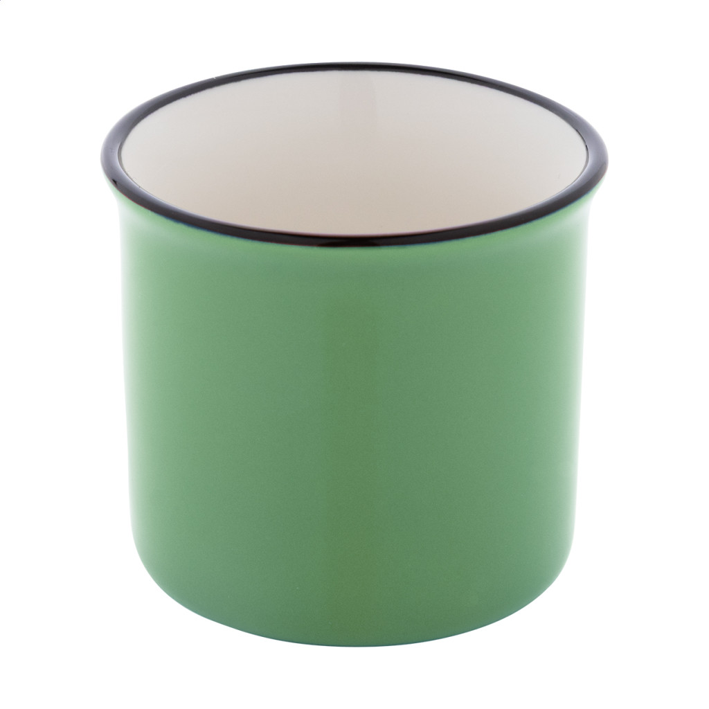 Mini vintage kerámia bögre fekete peremmel, belül fehér kívül színes bevonattal, 90 ml. Kraft papír dobozban.