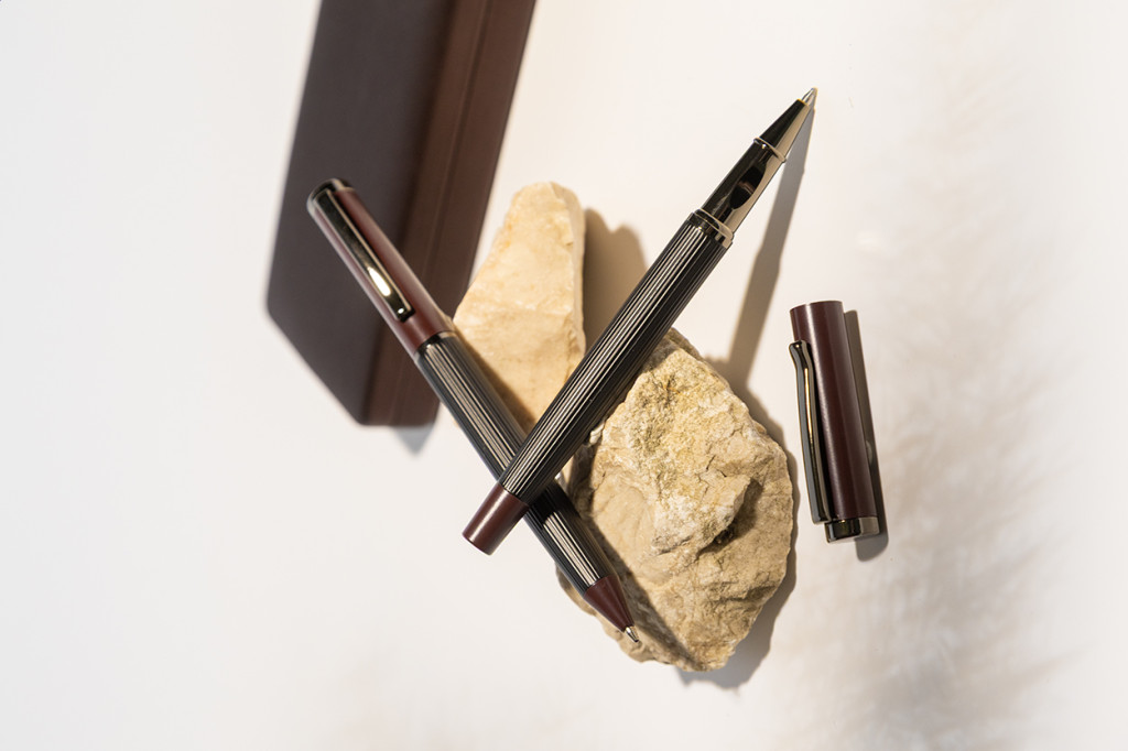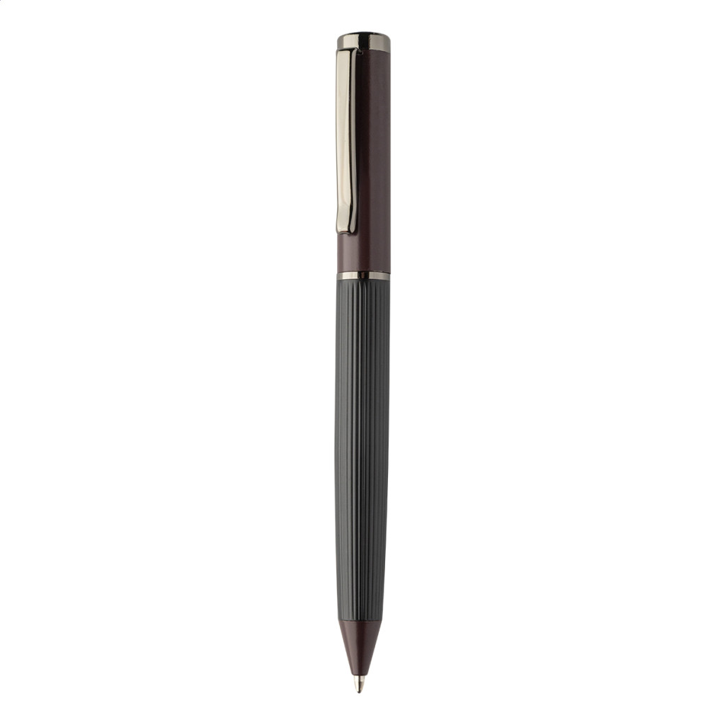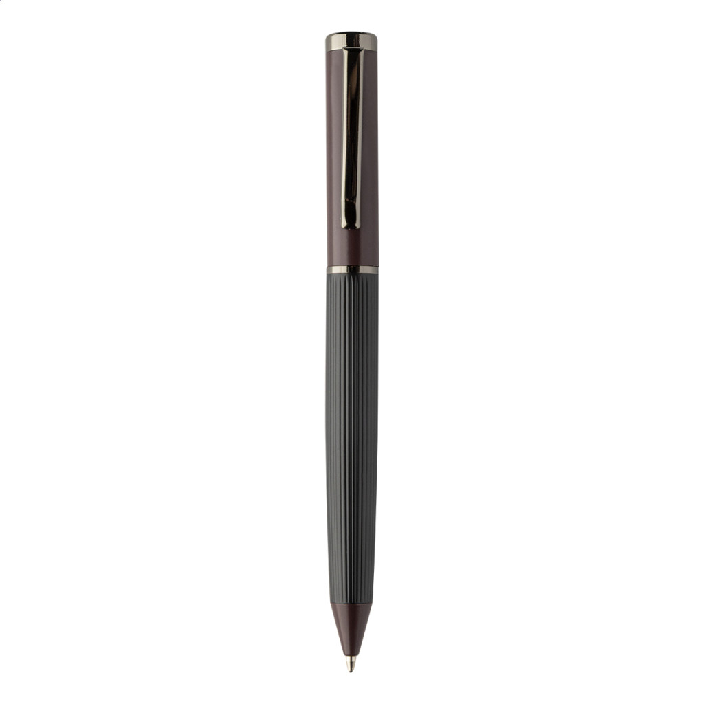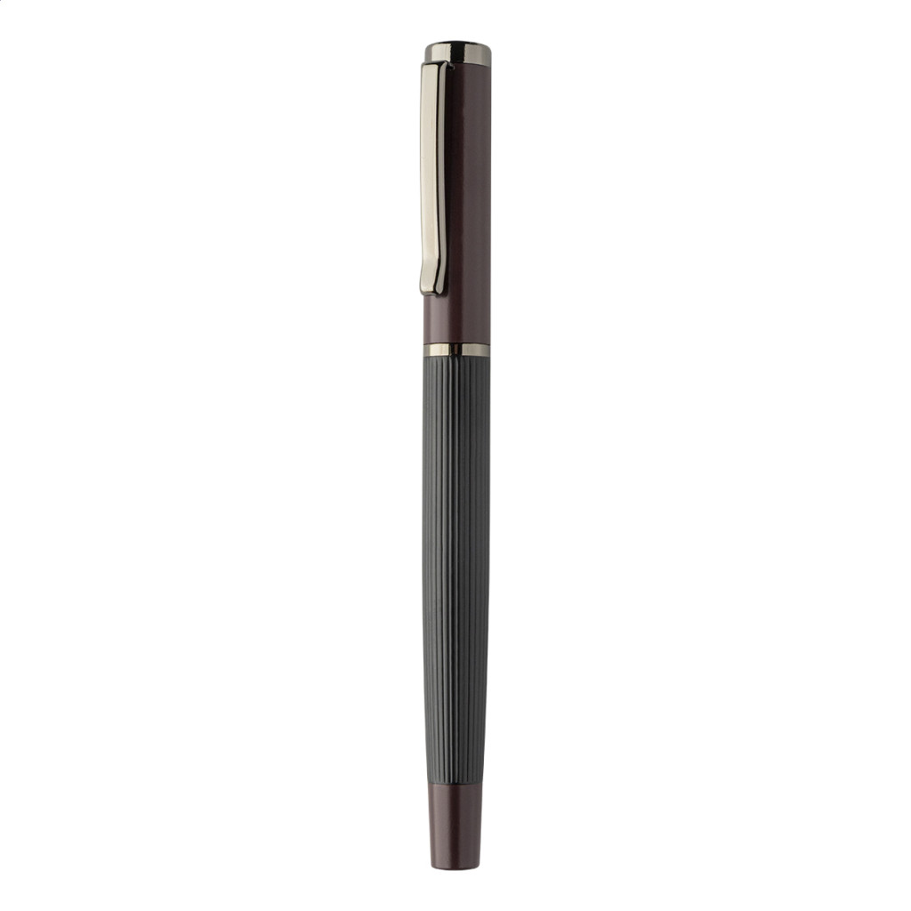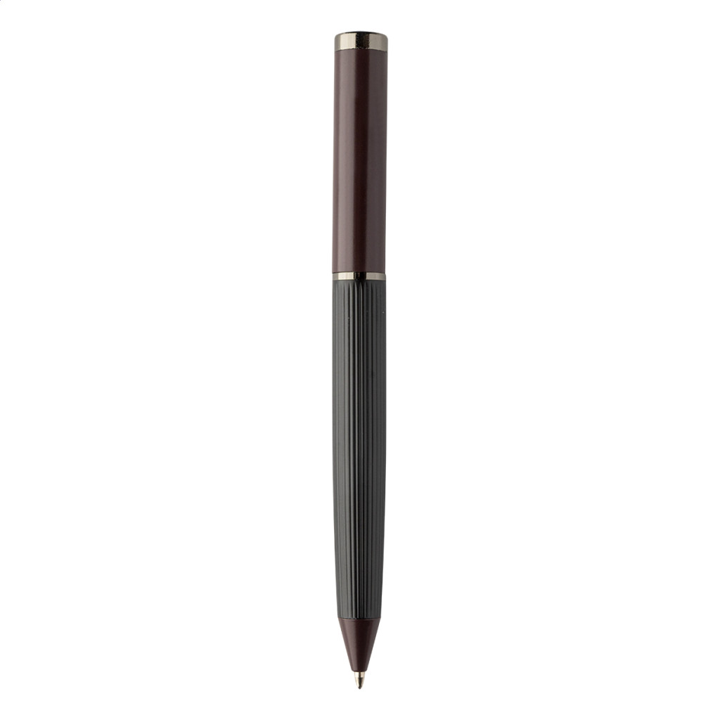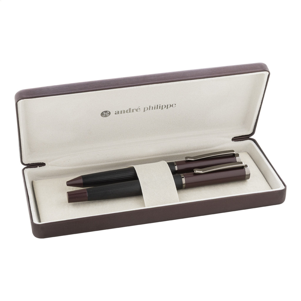 Elegáns, fém golyóstoll és rollertoll szett csíkos testtel, színes díszítőelemekkel és fényes fegyverfém részletekkel. Színben hozzáillő ajándékdobozban, kék tollbetéttel. André Philippe márkatermék.
