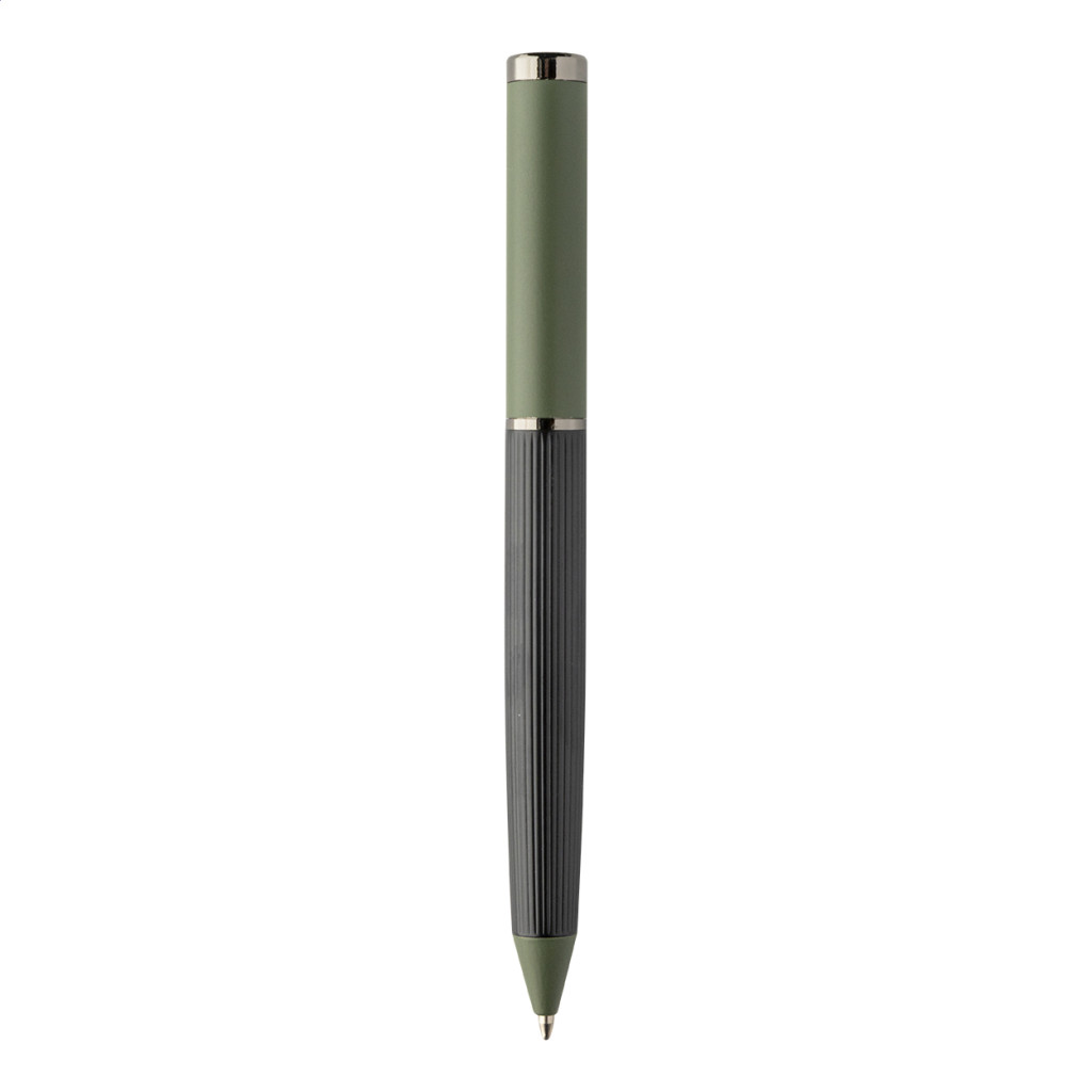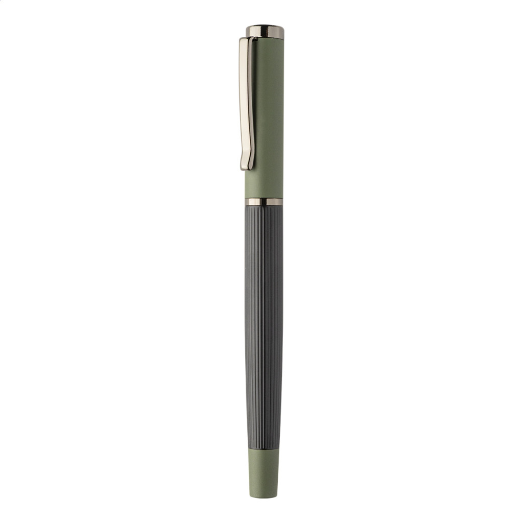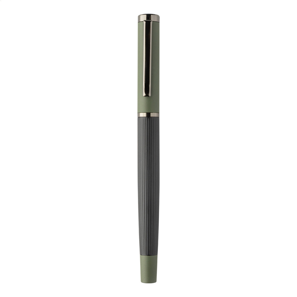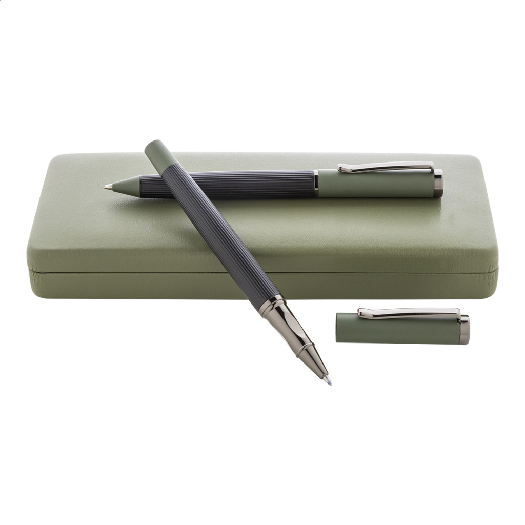 Elegáns, fém golyóstoll és rollertoll szett csíkos testtel, színes díszítőelemekkel és fényes fegyverfém részletekkel. Színben hozzáillő ajándékdobozban, kék tollbetéttel. André Philippe márkatermék.