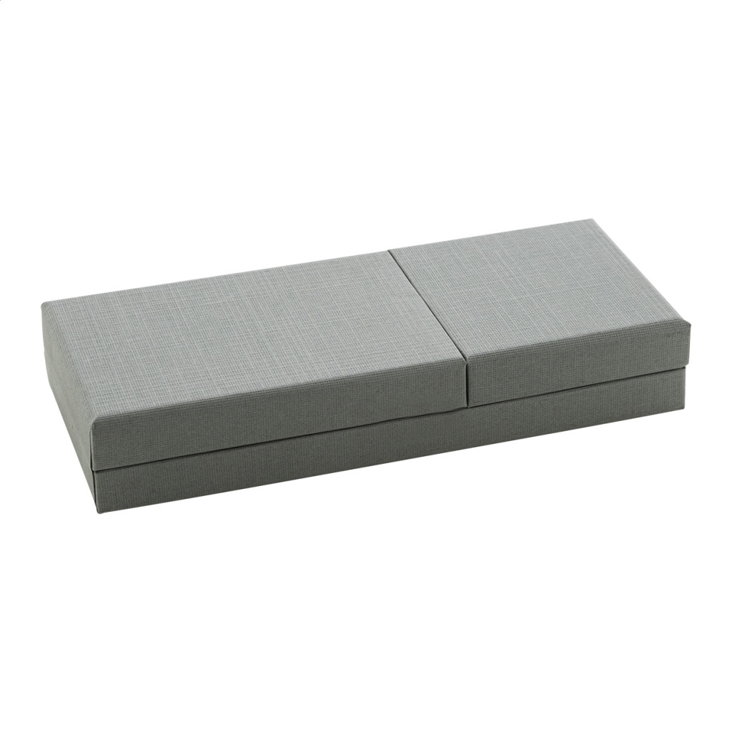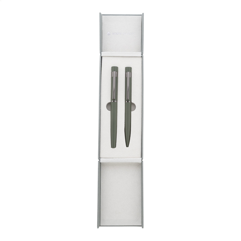 Elegáns, fém golyóstoll és rollertoll szett fényes fegyverfém részletekkel. Színben hozzáillő ajándékdobozban, kék tollbetéttel. André Philippe márkatermék.