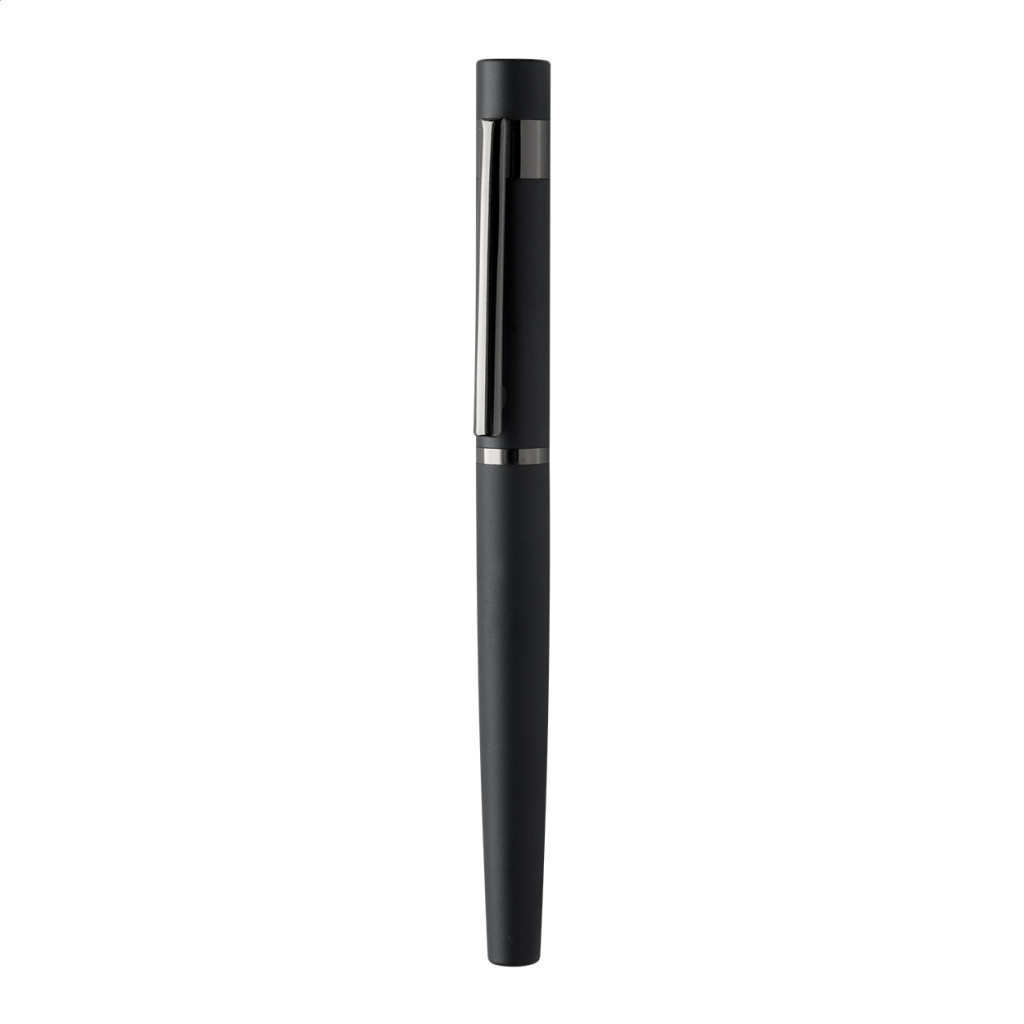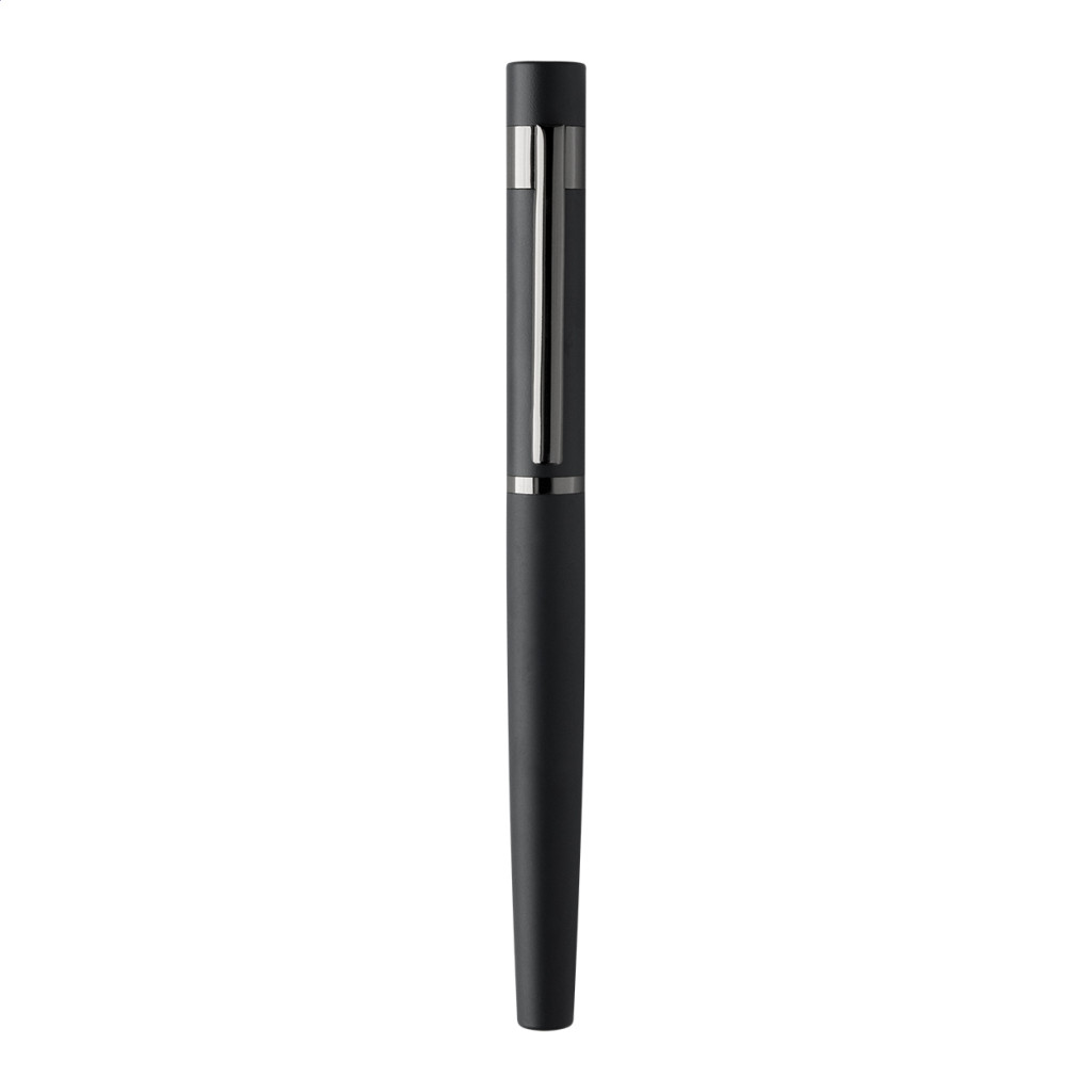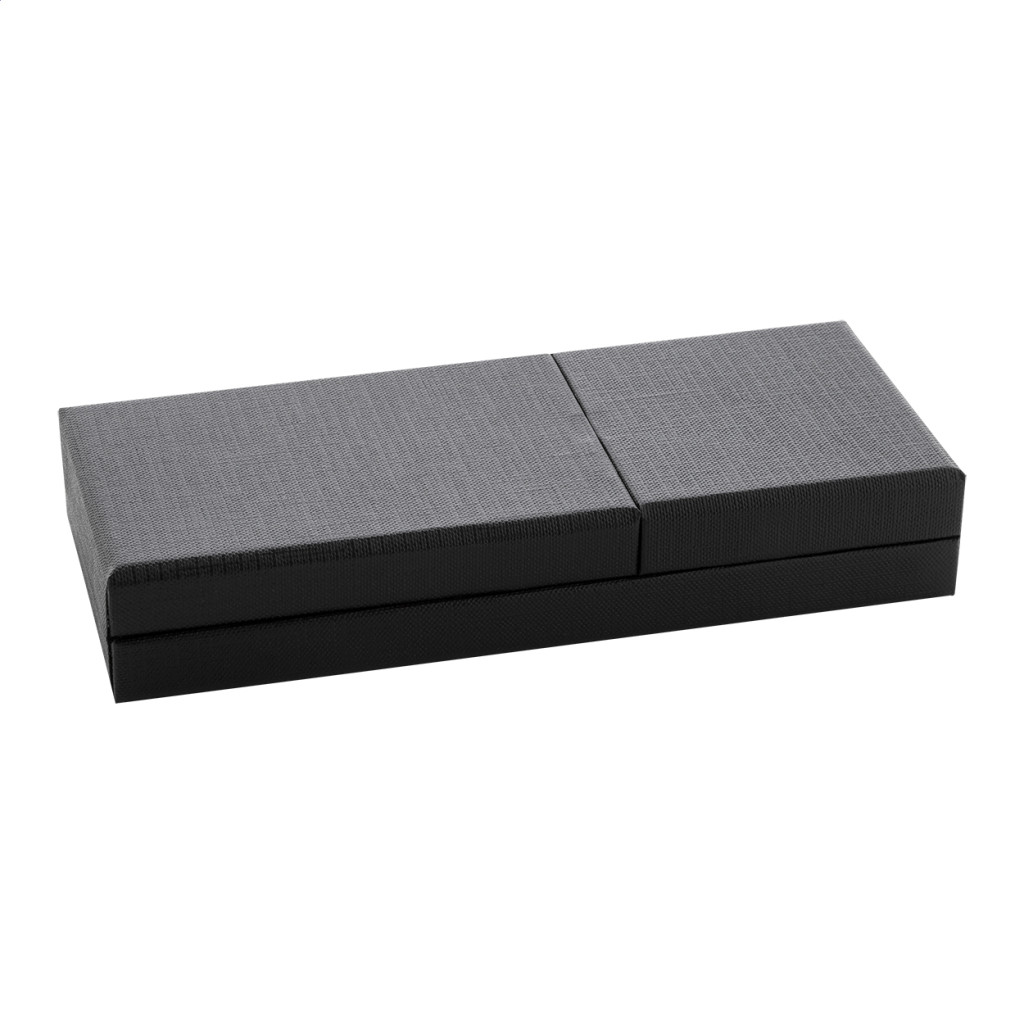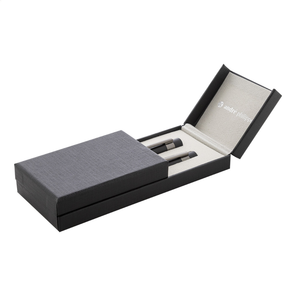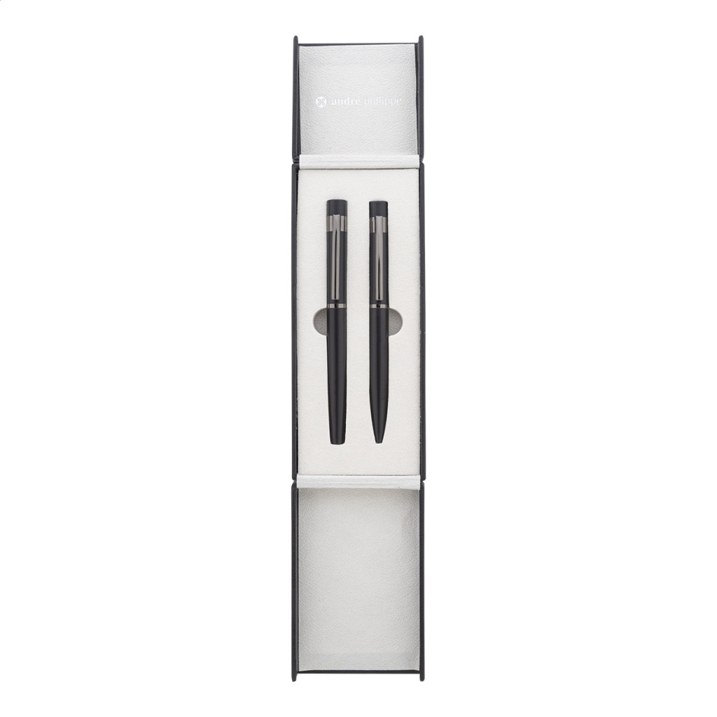 Elegáns, fém golyóstoll és rollertoll szett fényes fegyverfém részletekkel. Színben hozzáillő ajándékdobozban, kék tollbetéttel. André Philippe márkatermék.