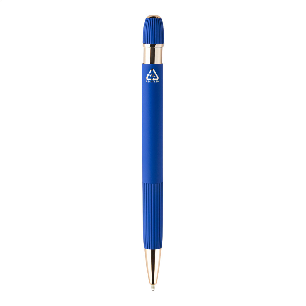 Újrahasznosított alumínium golyóstoll gumírozott testtel és rózsaarany részletekkel. Speciális bevonattal a tükörlézeres gravírozáshoz rózsaarany színben. Kék tollbetéttel.