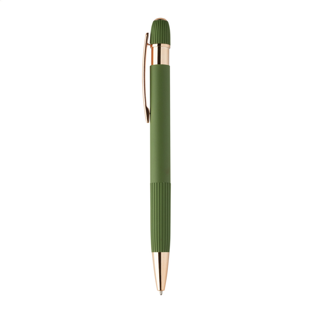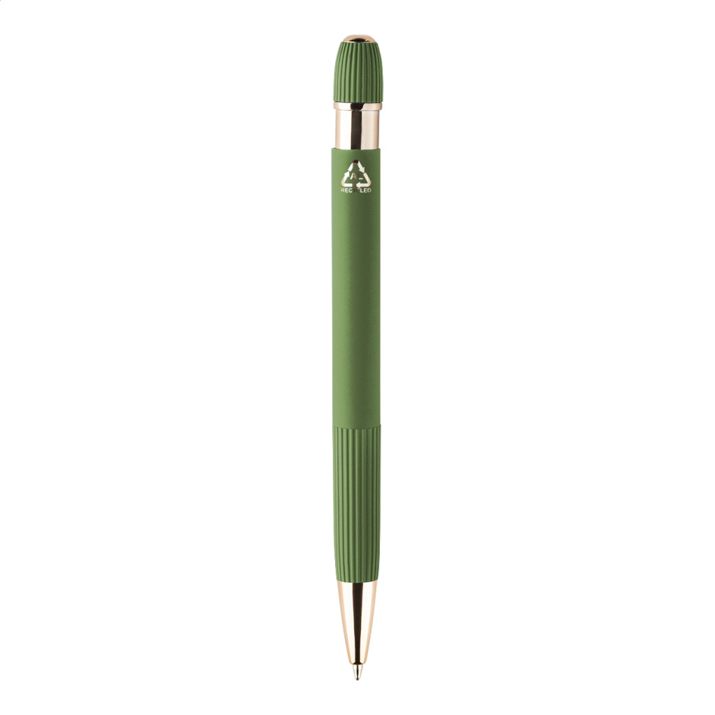 Újrahasznosított alumínium golyóstoll gumírozott testtel és rózsaarany részletekkel. Speciális bevonattal a tükörlézeres gravírozáshoz rózsaarany színben. Kék tollbetéttel.