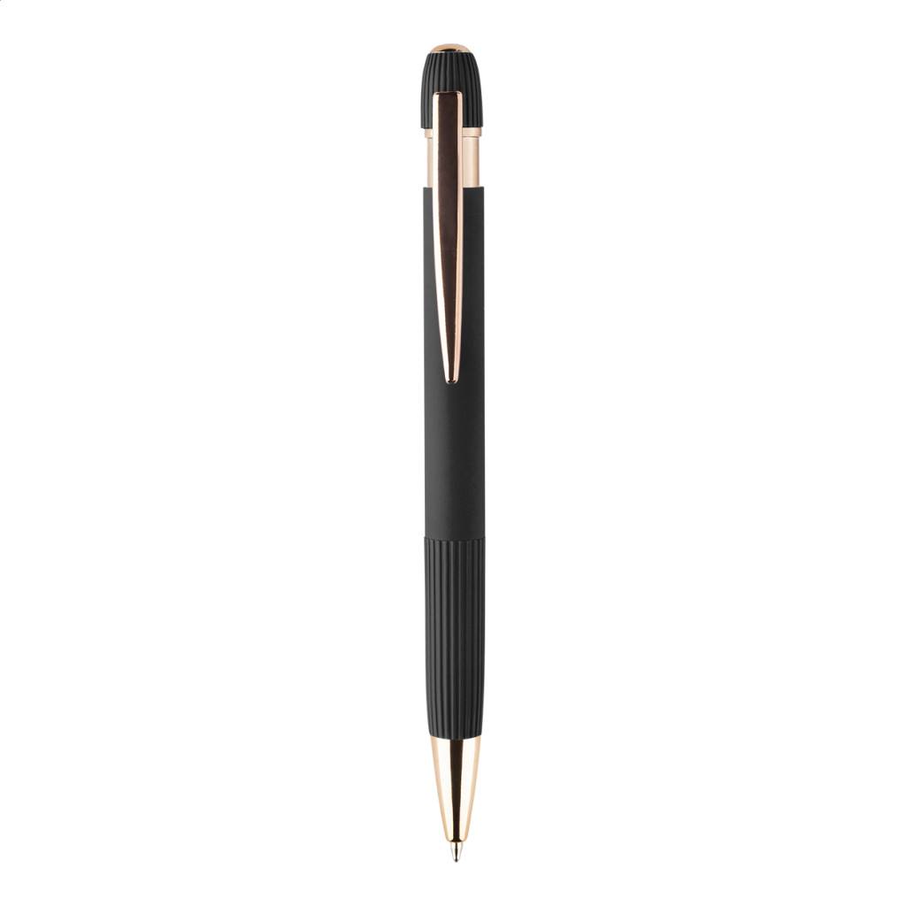Újrahasznosított alumínium golyóstoll gumírozott testtel és rózsaarany részletekkel. Speciális bevonattal a tükörlézeres gravírozáshoz rózsaarany színben. Kék tollbetéttel.