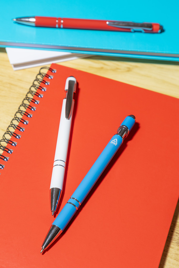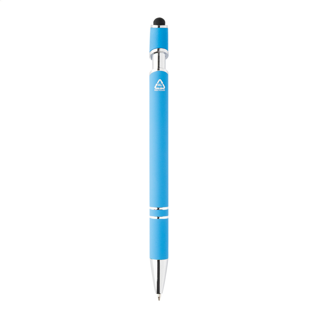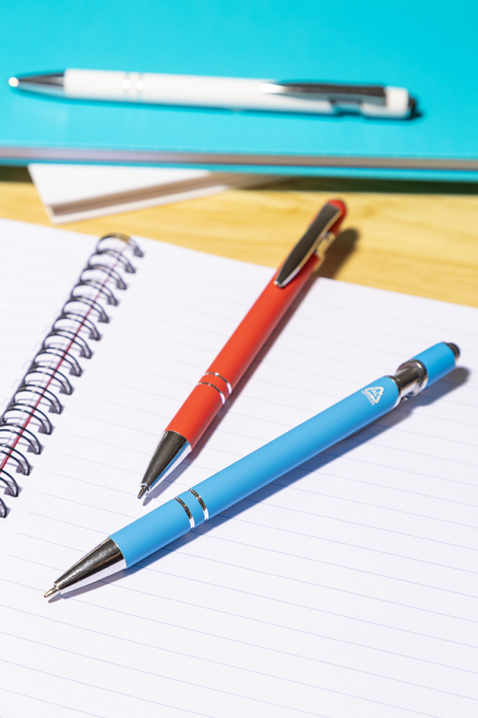 Újrahasznosított alumínium golyóstoll gumírozott testtel és króm részletekkel. Kék tollbetéttel.