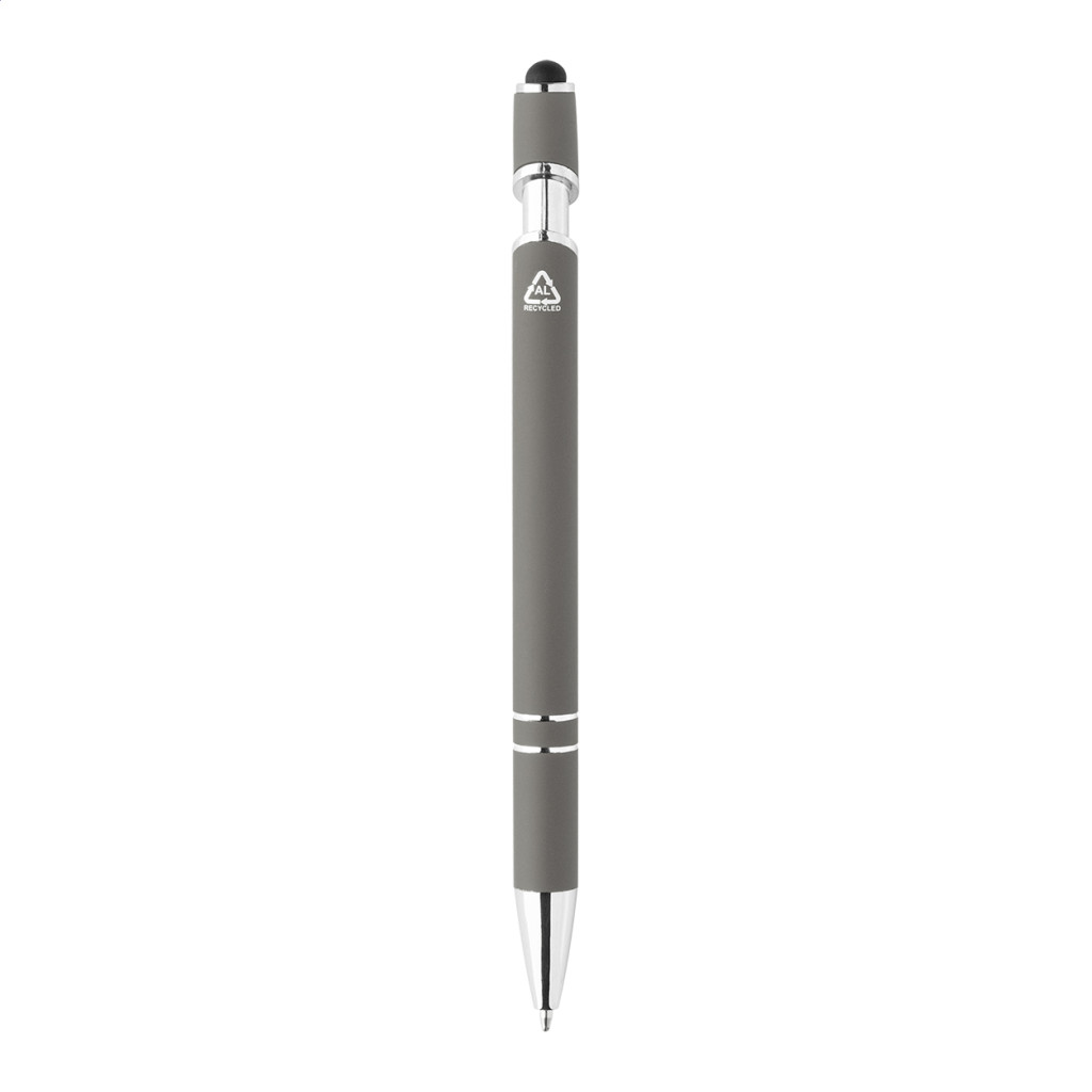 Újrahasznosított alumínium golyóstoll gumírozott testtel és króm részletekkel. Kék tollbetéttel.