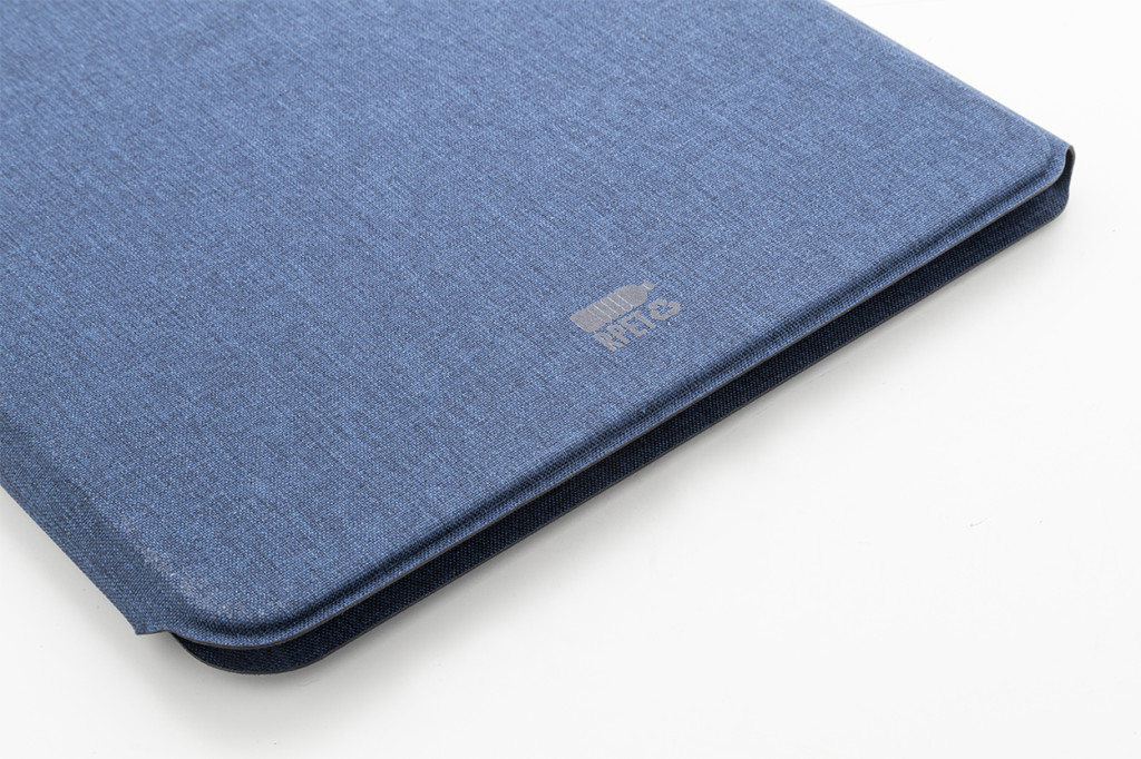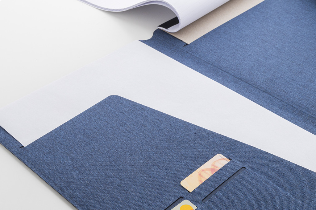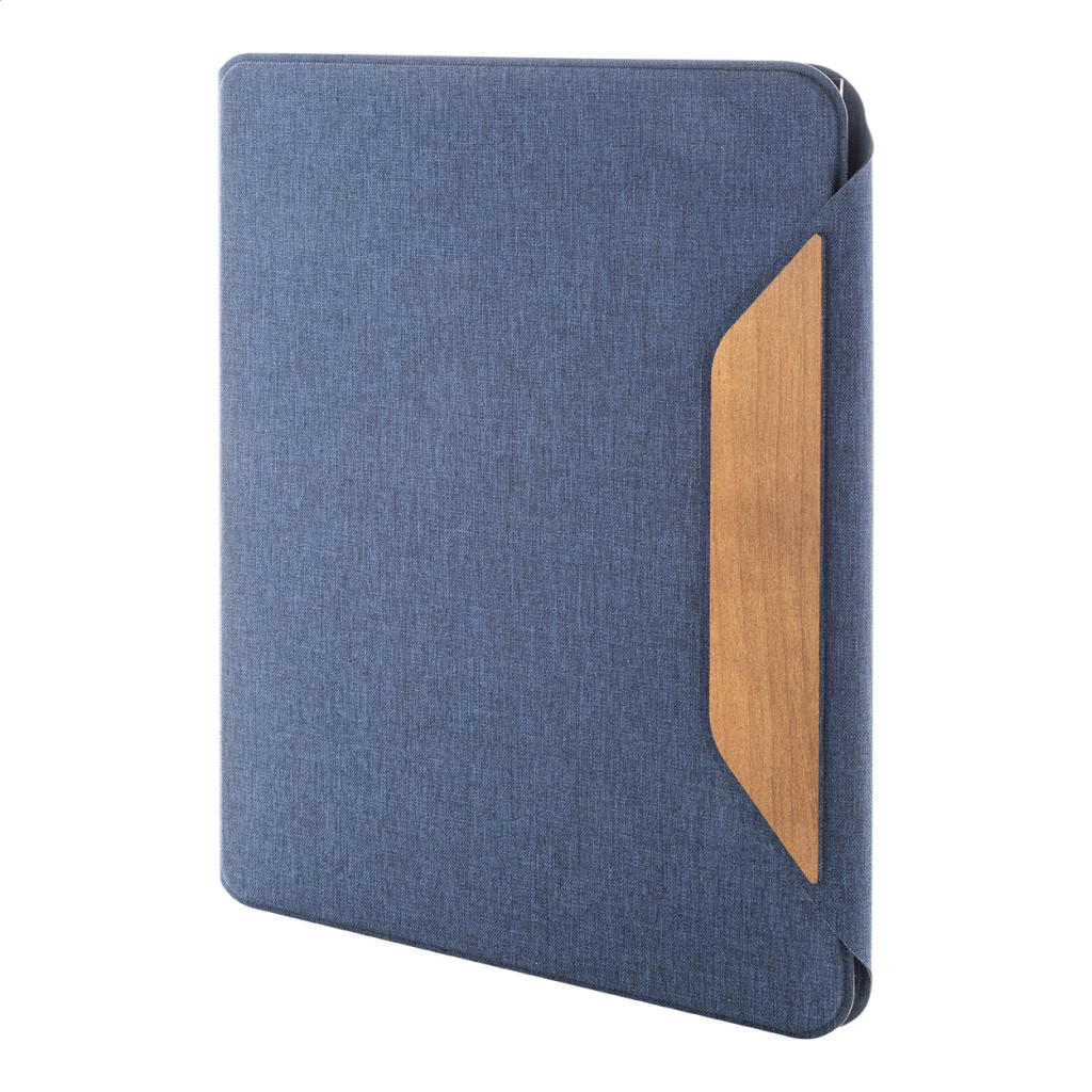 A4 méretű, RPET poliészter iratmappa több belső rendszerező zsebbel és mágneses zárral, diófa díszítéssel. 20 újrahasznosított papír anyagú, vonalas lapos jegyzetfüzettel.