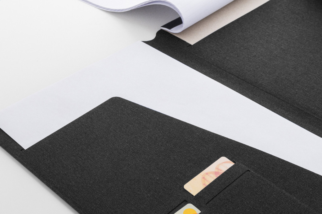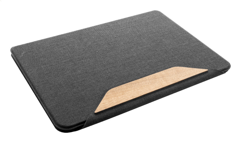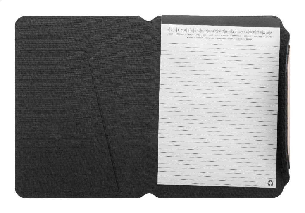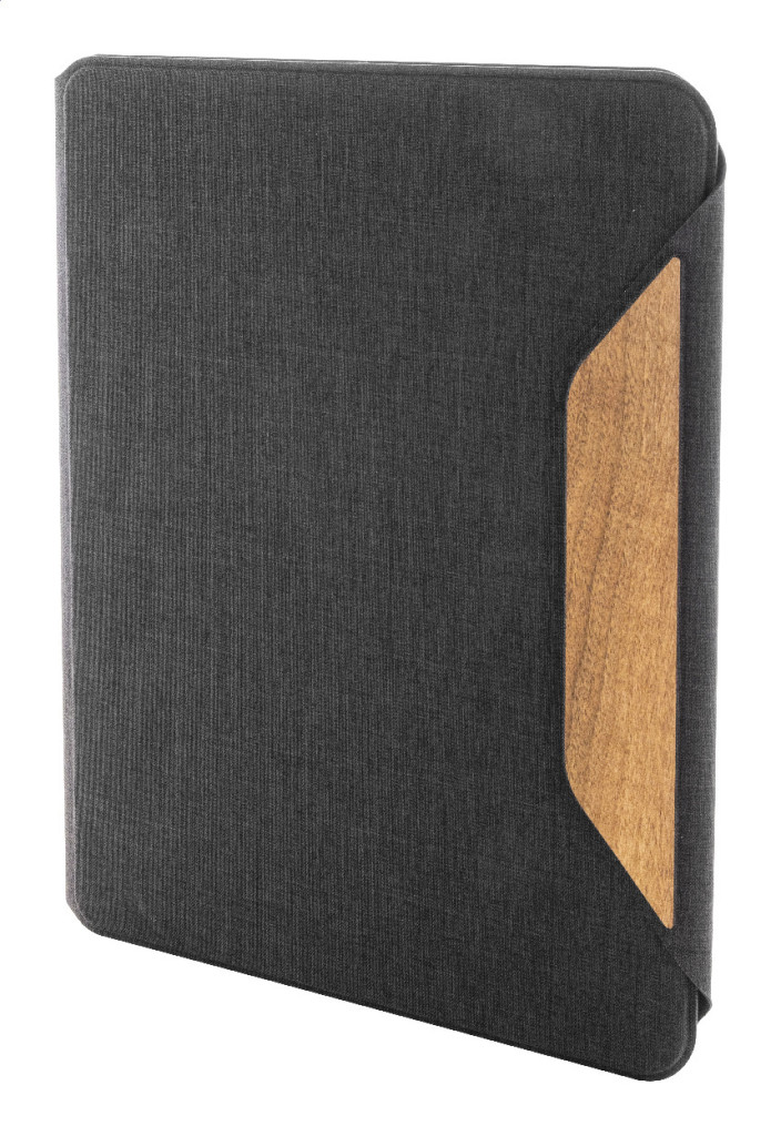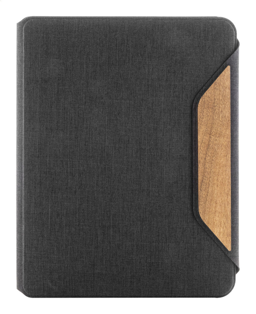A4 méretű, RPET poliészter iratmappa több belső rendszerező zsebbel és mágneses zárral, diófa díszítéssel. 20 újrahasznosított papír anyagú, vonalas lapos jegyzetfüzettel.