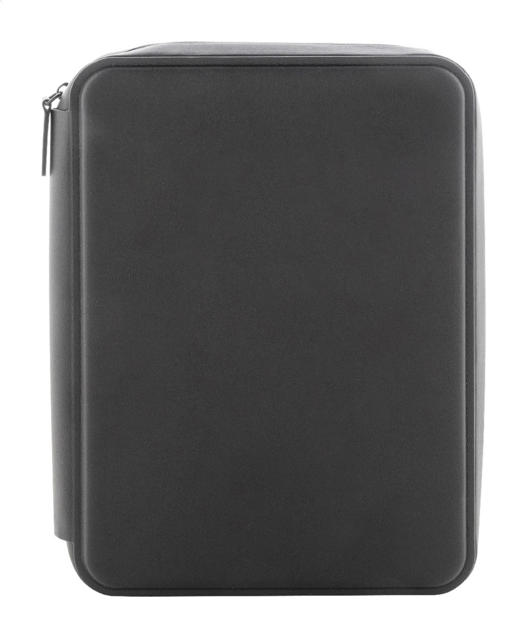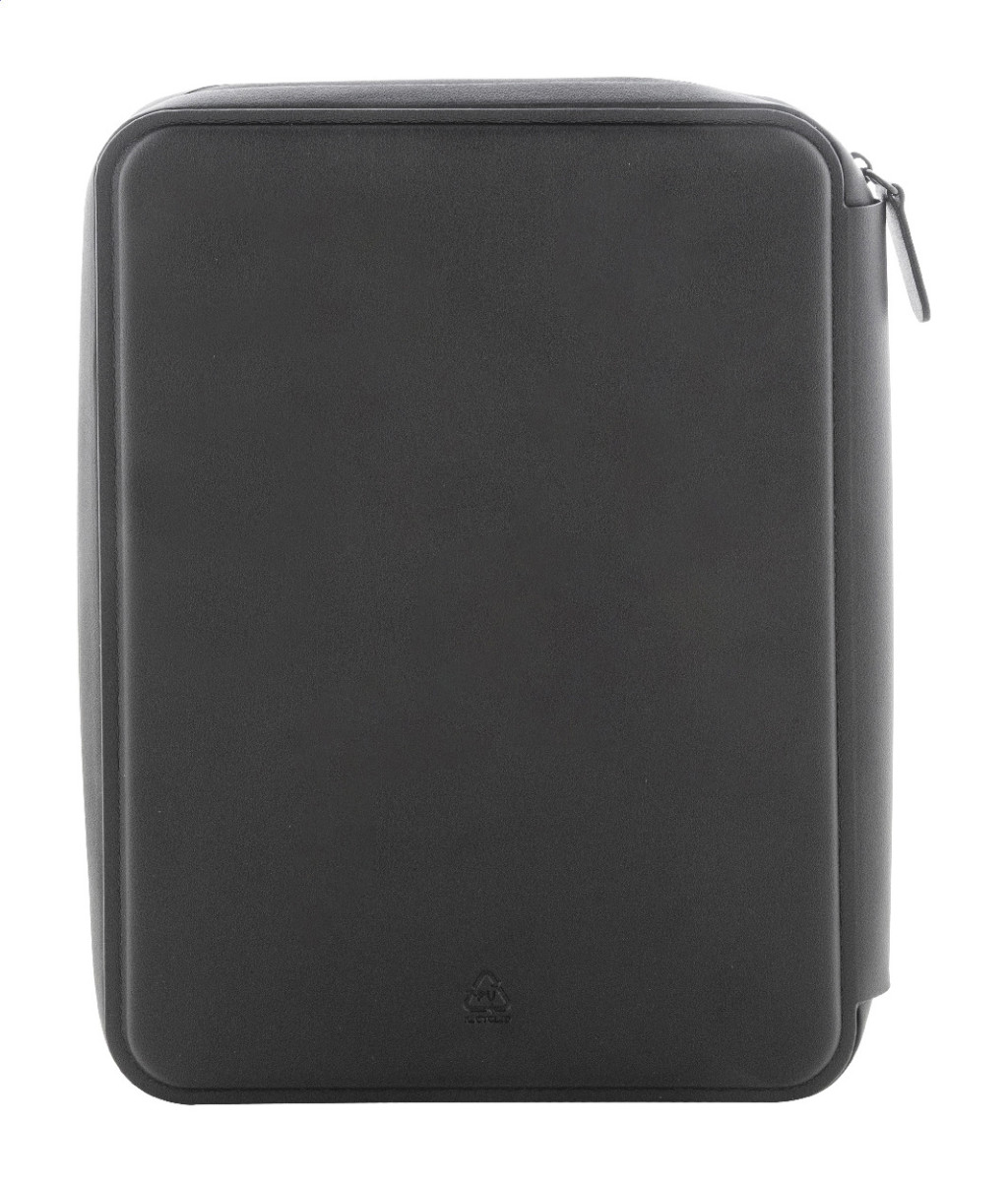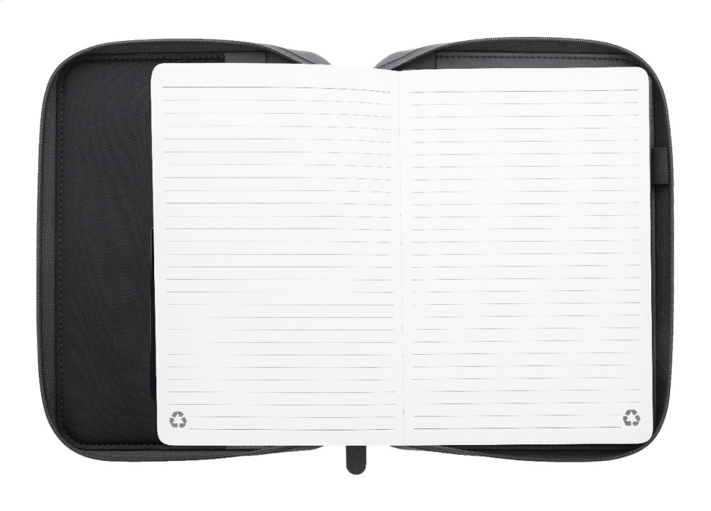 Cipzáras, luxus iratmappa újrahasznosított PU bőrből, 64 újrahasznosított papír anyagú, vonalas lapos jegyzetfüzettel. Több belső zsebbel kártyáknak és dokumentumoknak. A5 méret.