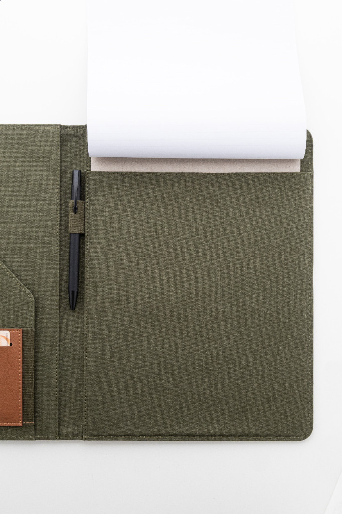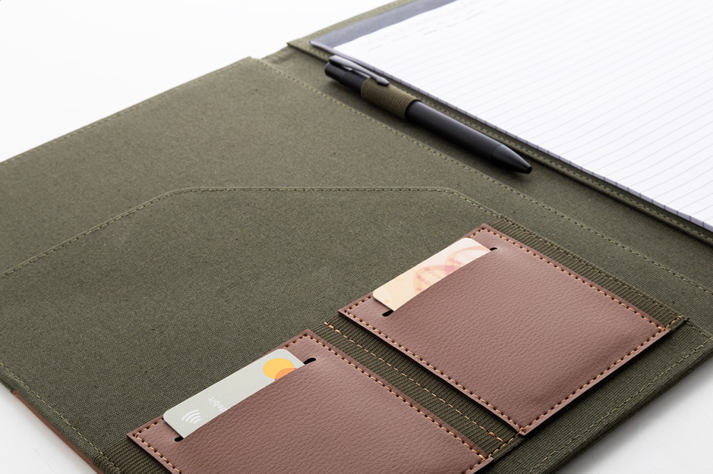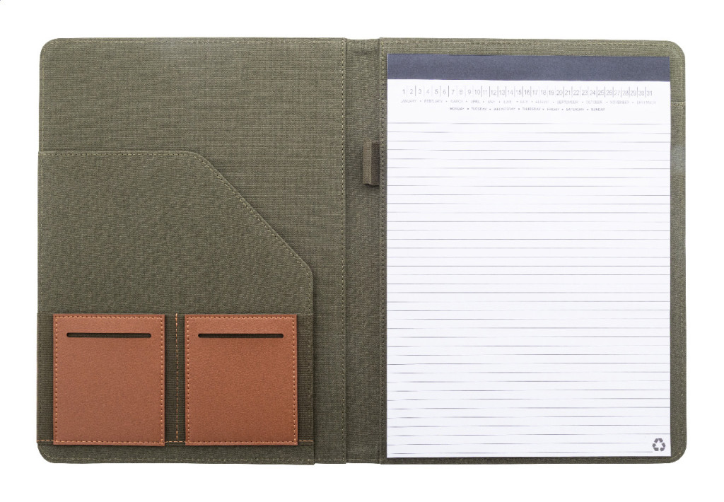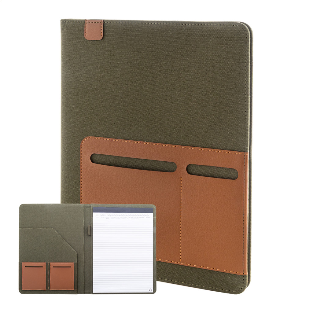 A4 méretű, újrahasznosított vászonból és újrahasznosított PU bőrből készült iratmappa több elülső és belső rendező zsebbel. 20 újrahasznosított papír anyagú, vonalas lapos jegyzetfüzettel. 70% újrahasznosított pamut és 30% RPET poliészter.