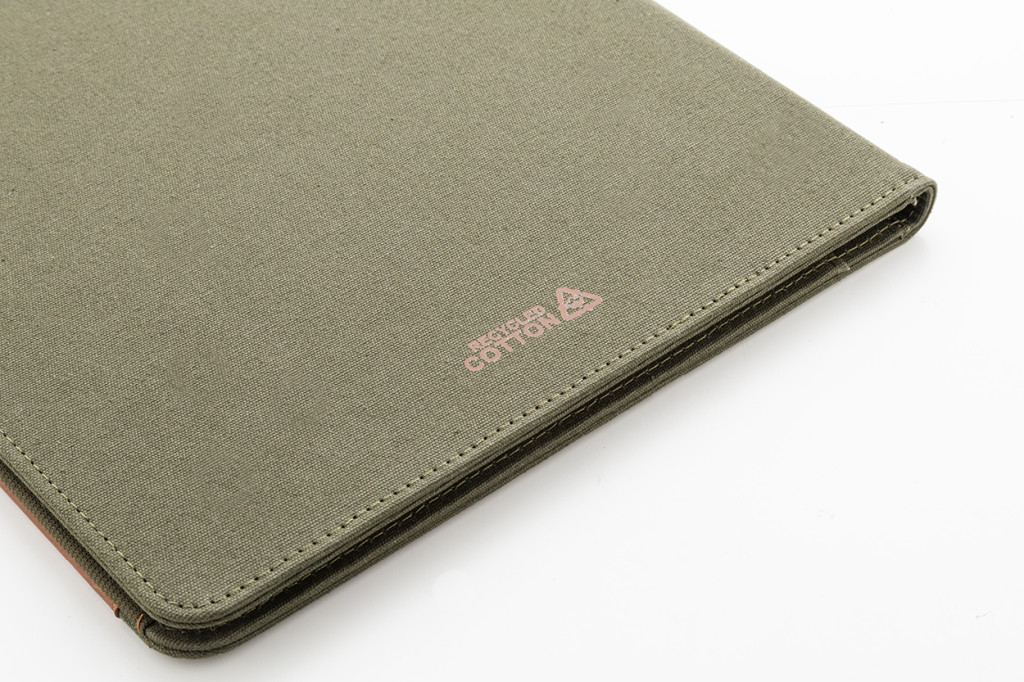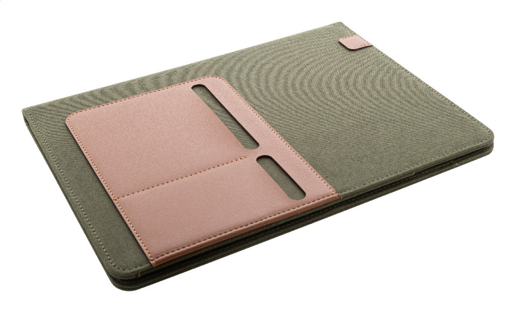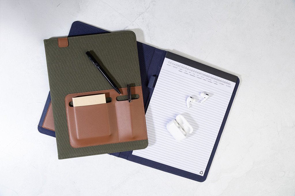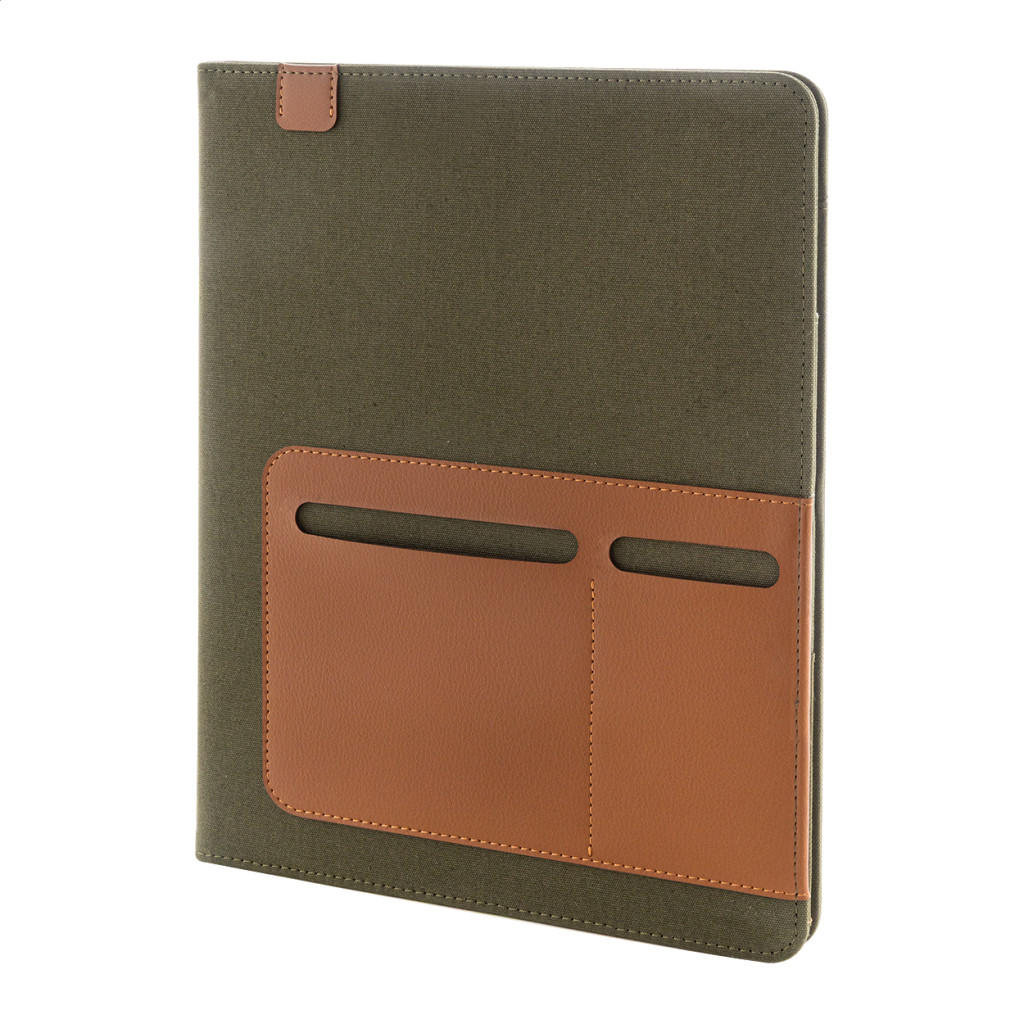 A4 méretű, újrahasznosított vászonból és újrahasznosított PU bőrből készült iratmappa több elülső és belső rendező zsebbel. 20 újrahasznosított papír anyagú, vonalas lapos jegyzetfüzettel. 70% újrahasznosított pamut és 30% RPET poliészter.