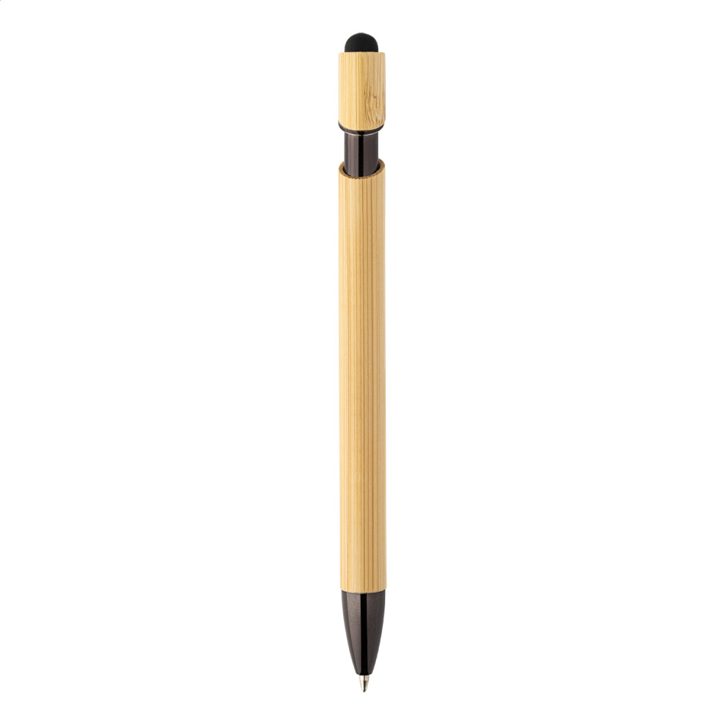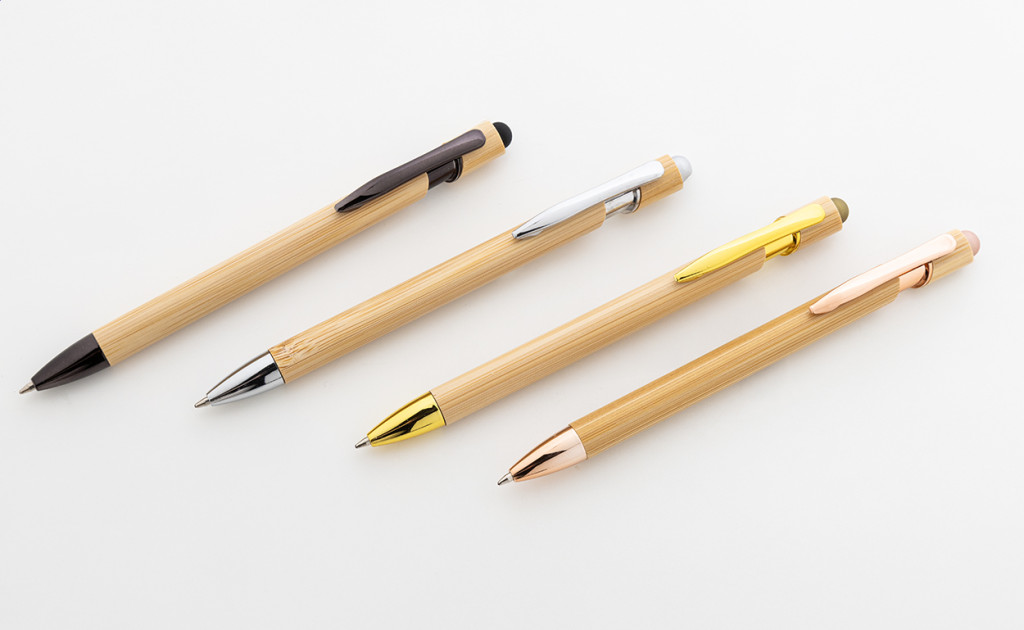 Bambusz érintőképernyős golyóstoll fényes fém részletekkel, hozzá illő színű érintőceruzával. Kék tollbetéttel.