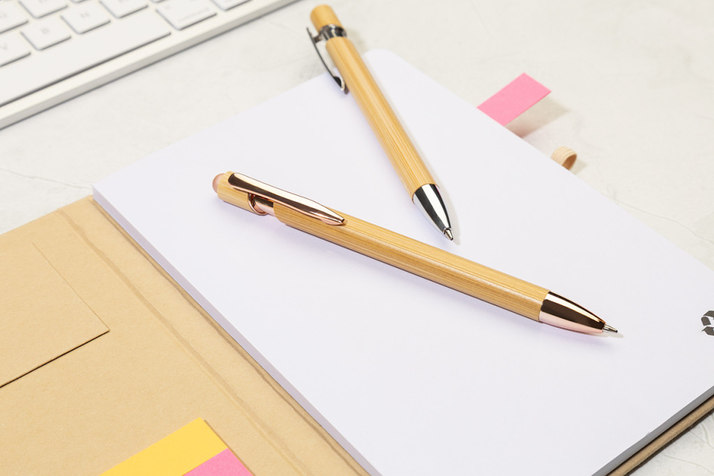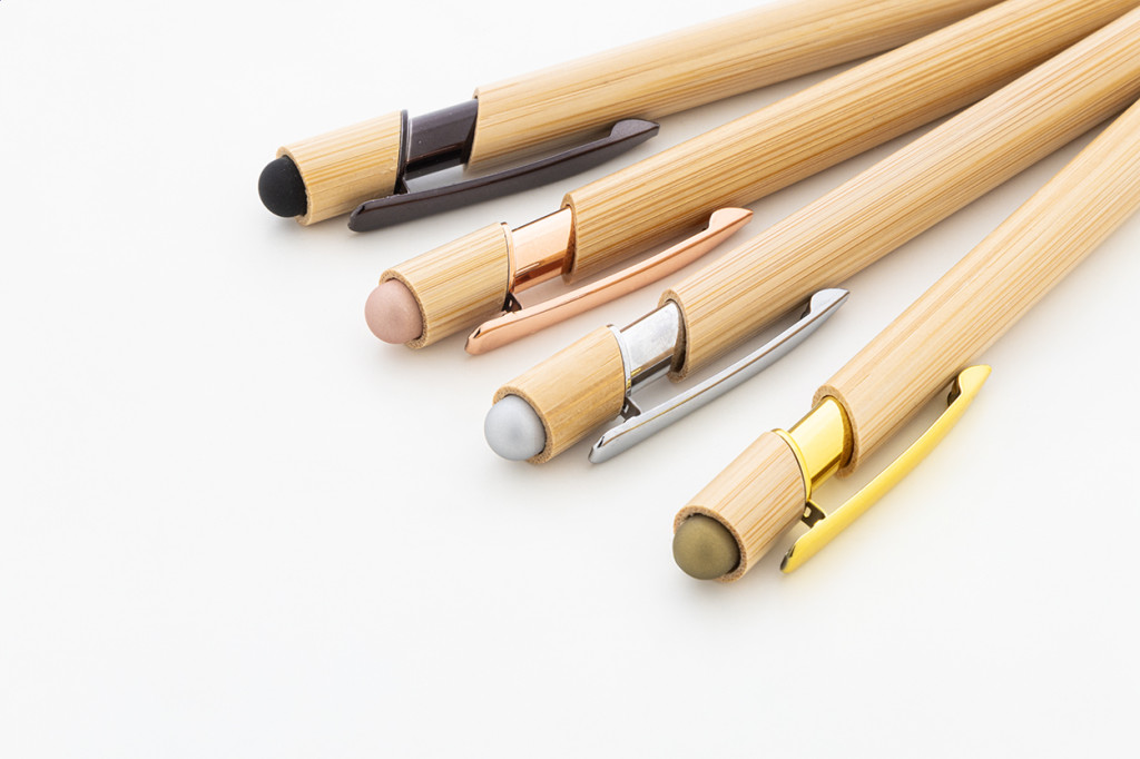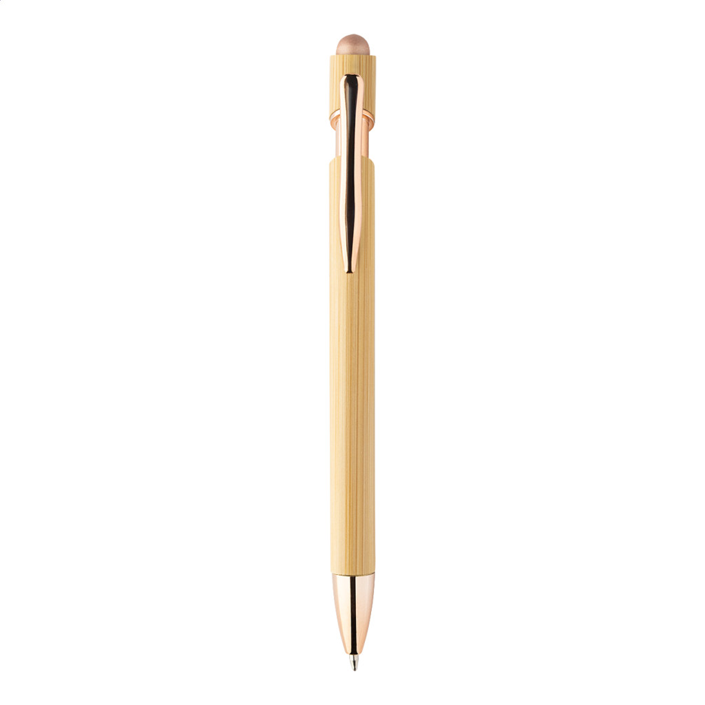 Bambusz érintőképernyős golyóstoll fényes fém részletekkel, hozzá illő színű érintőceruzával. Kék tollbetéttel.