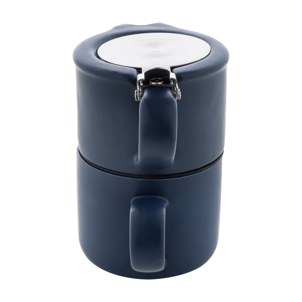 Kiváló minőségű kerámia teáskészlet matt felülettel. Tartalmaz egy teáskannát (430 ml) rozsdamentes acél fedéllel és teaszűrővel, amely illeszkedik a hozzá tartozó bögréhez (400 ml). Kraft papír dobozban.