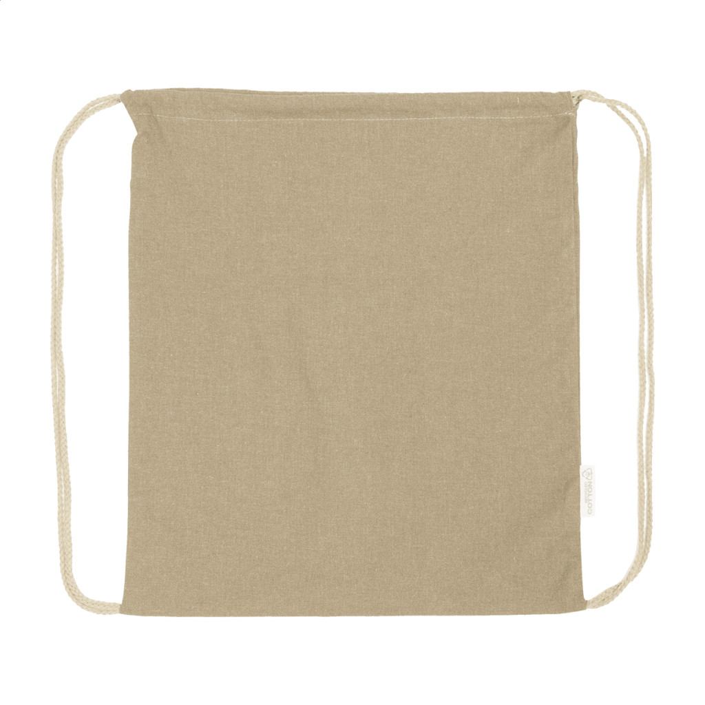70% újrahasznosított pamutból és 30% RPET poliészterből készült hátizsák, 140 g/m². Megkülönböztető újrahasznosított pamut címkével.