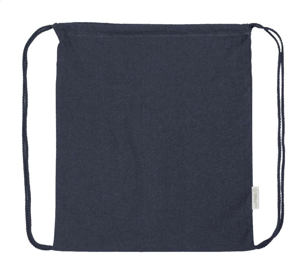 70% újrahasznosított pamutból és 30% RPET poliészterből készült hátizsák, 140 g/m². Megkülönböztető újrahasznosított pamut címkével.