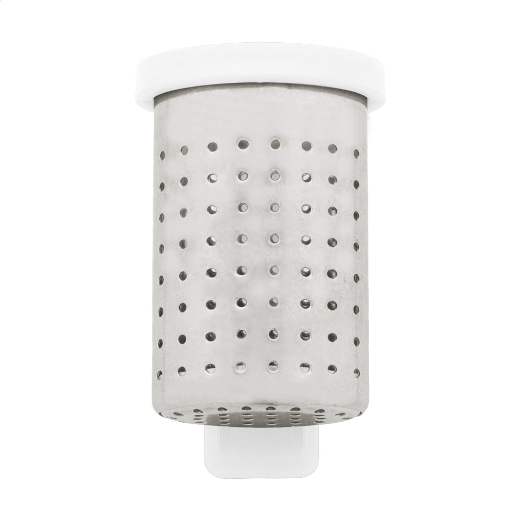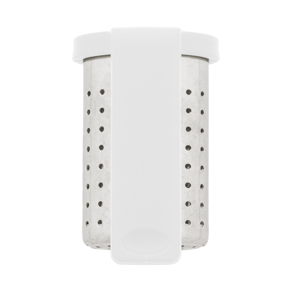 Rozsdamentes acél teaszűrő praktikus klipszes tartóval, újrahasznosított ABS műanyagből. Könnyen rögzíthető a bögre peremére.