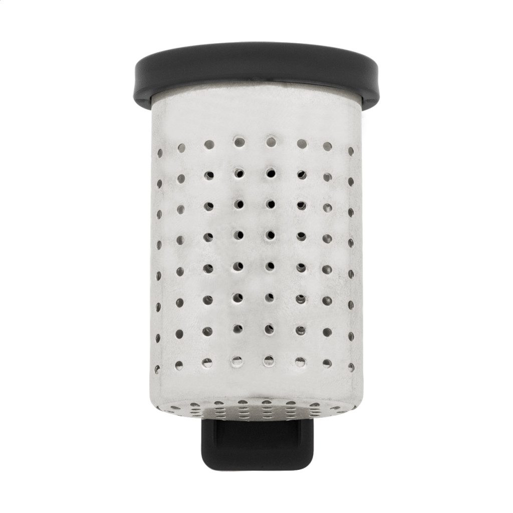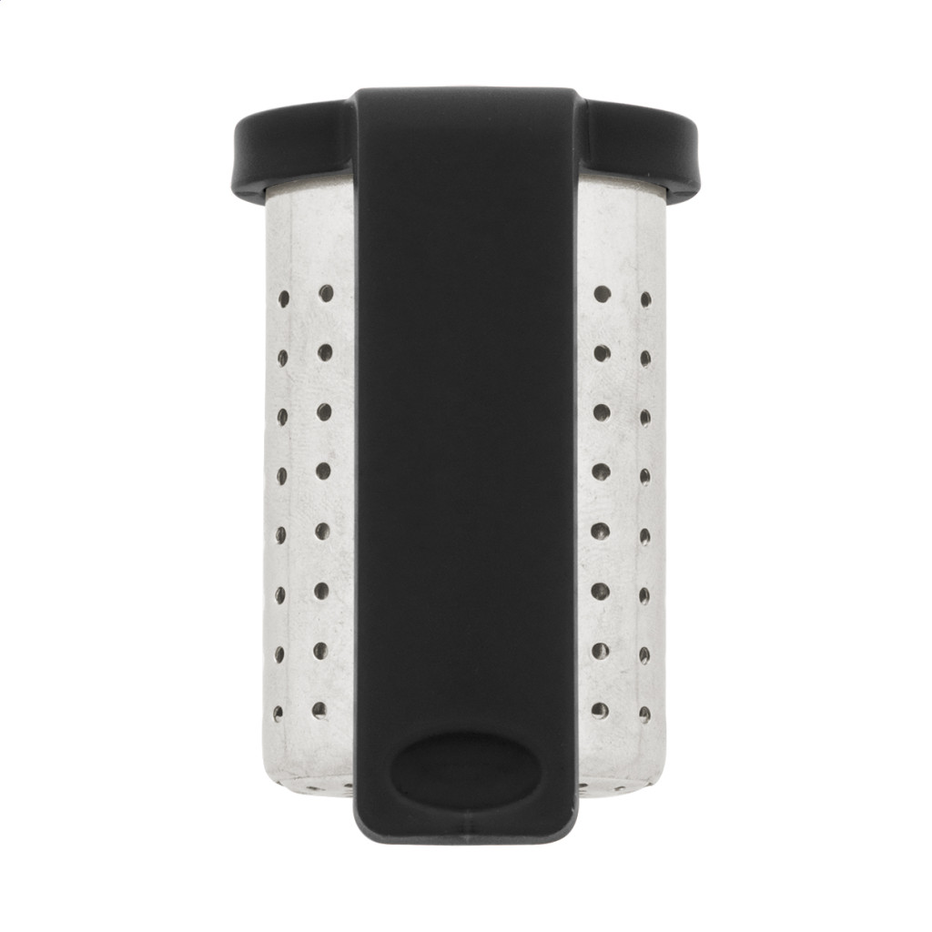 Rozsdamentes acél teaszűrő praktikus klipszes tartóval, újrahasznosított ABS műanyagből. Könnyen rögzíthető a bögre peremére.