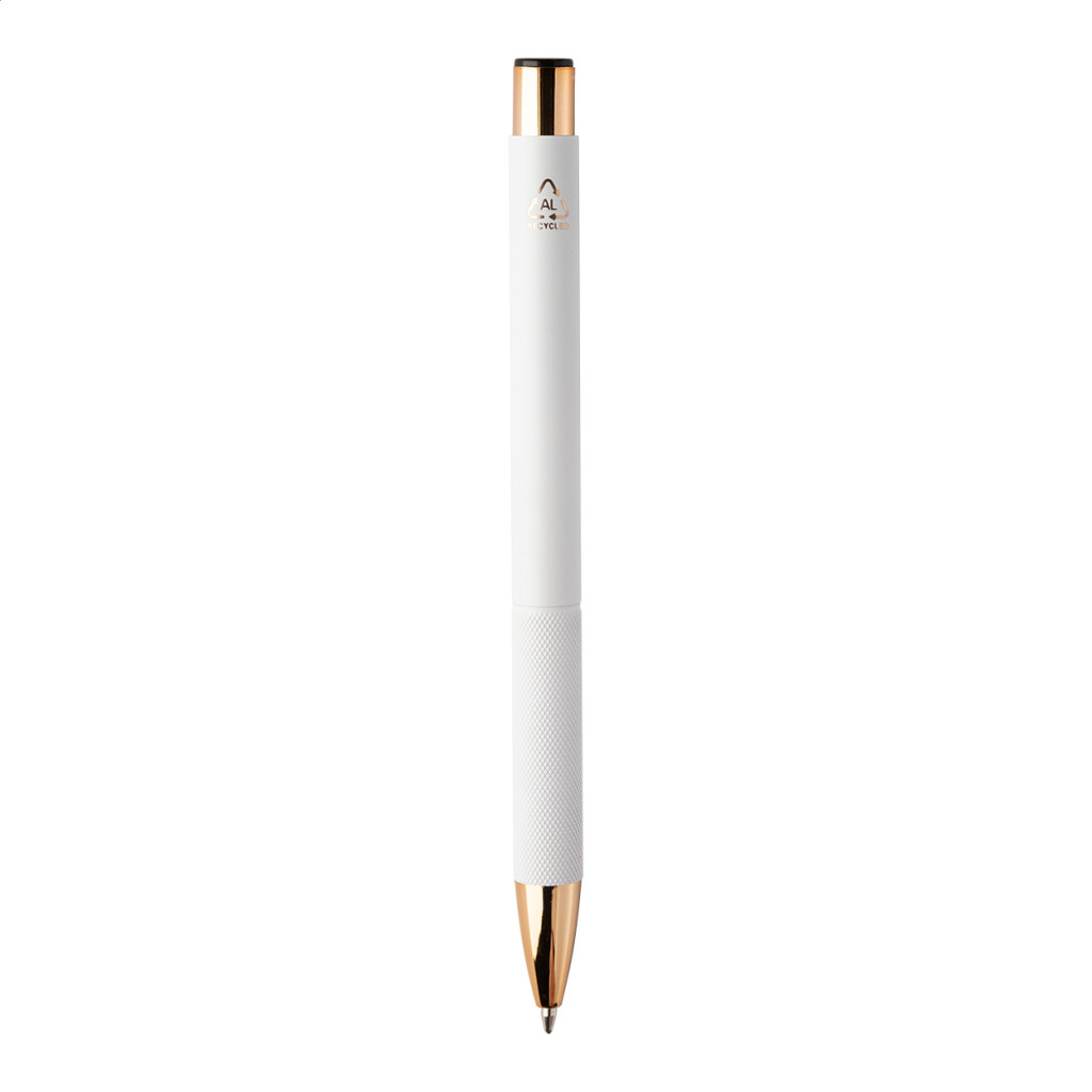 Újrahasznosított alumínium golyóstoll matt felületű testtel, texturált markolattal és rózsaarany részletekkel. Speciális bevonattal a tükörlézeres gravírozáshoz rózsaarany színben. Kék tollbetéttel.
