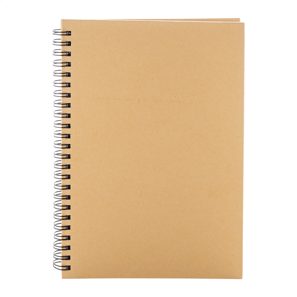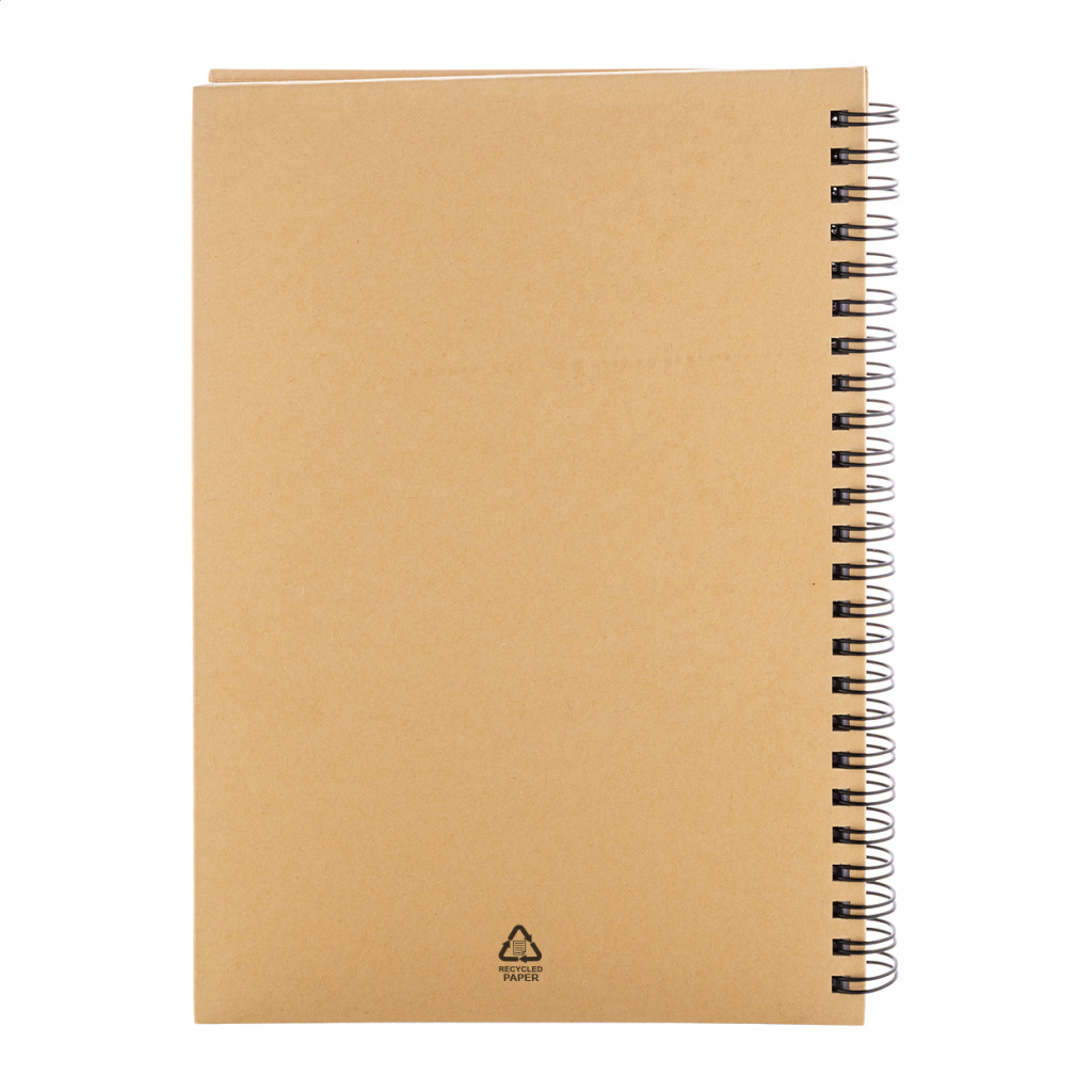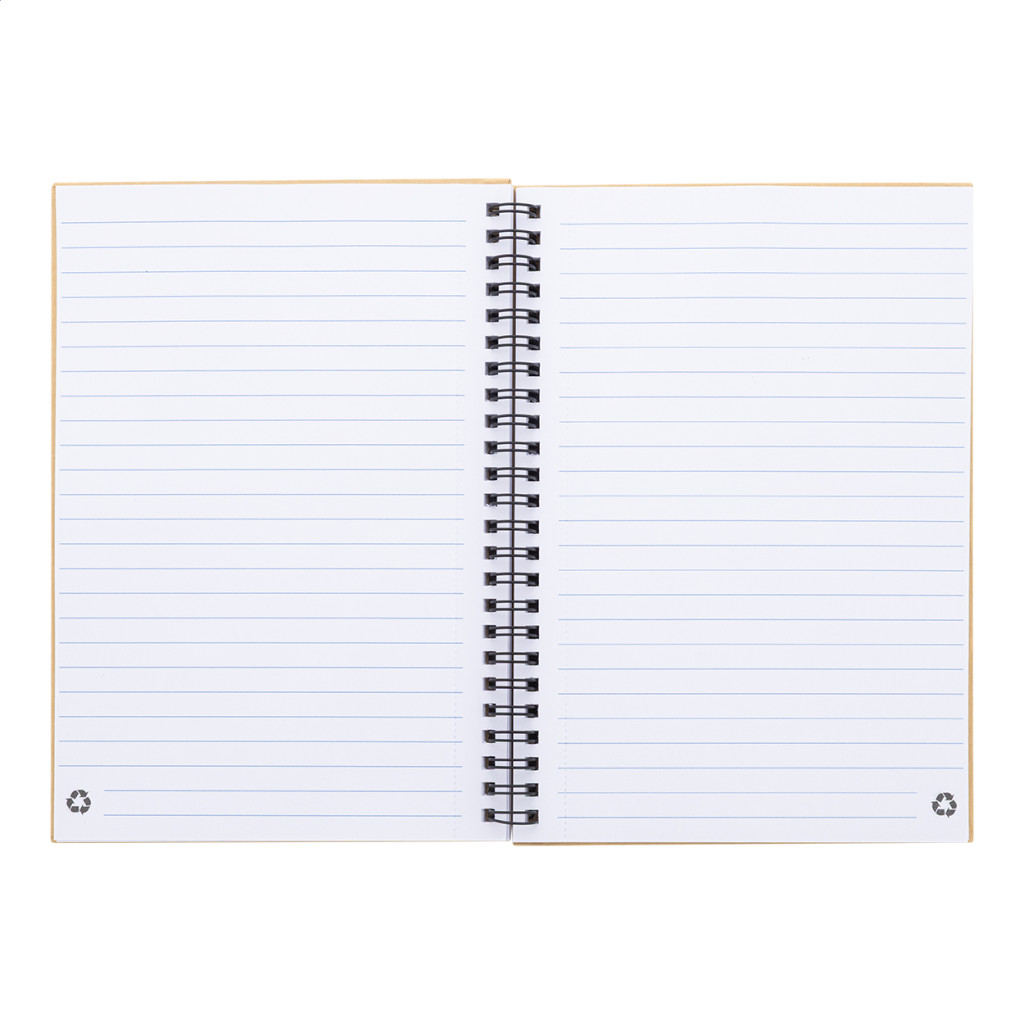 Újrahasznosított papír borítású spirál jegyzetfüzet 80 vonalas lappal, A5 méretű.
