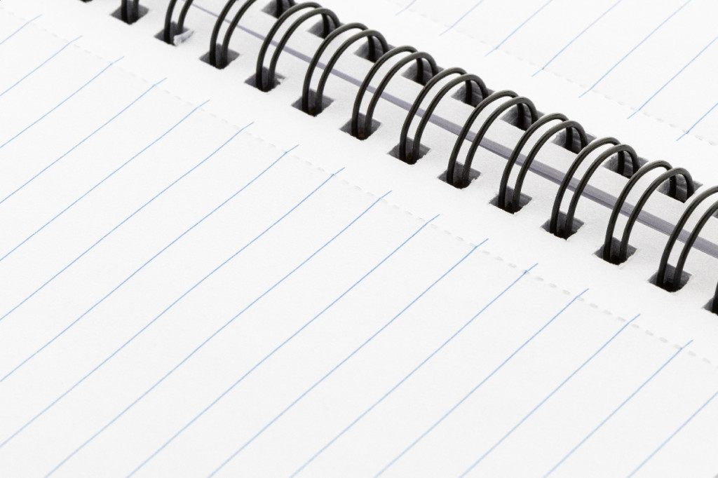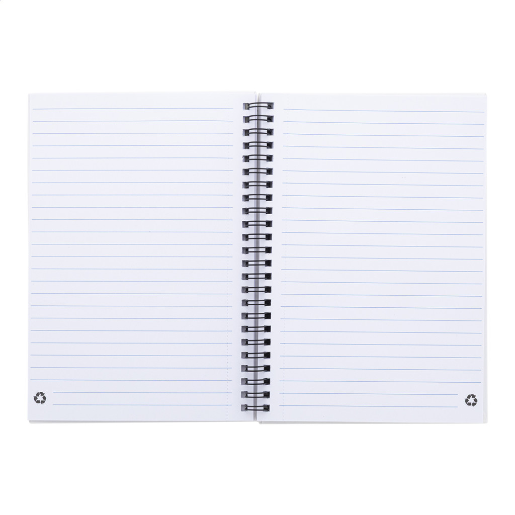 Újrahasznosított papír borítású spirál jegyzetfüzet 80 vonalas lappal, A5 méretű.