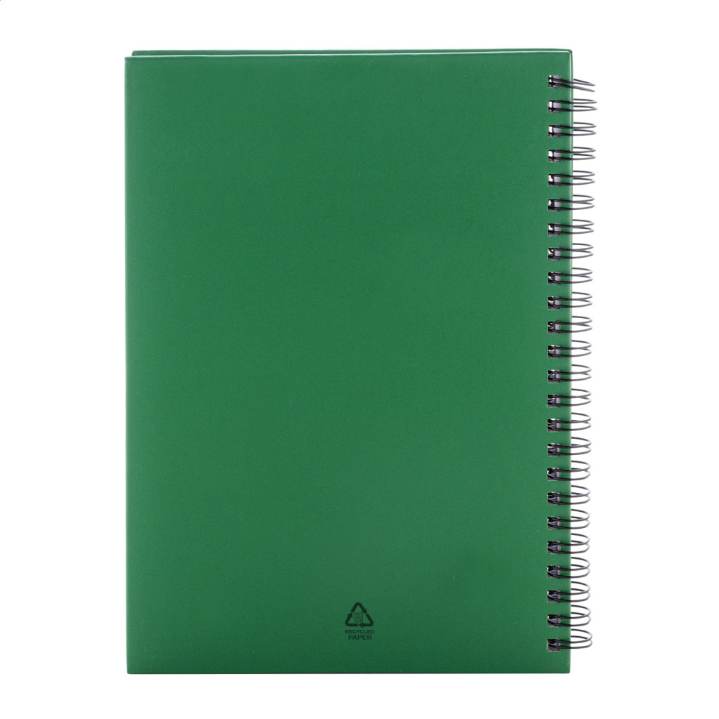 Újrahasznosított papír borítású spirál jegyzetfüzet 80 vonalas lappal, A5 méretű.