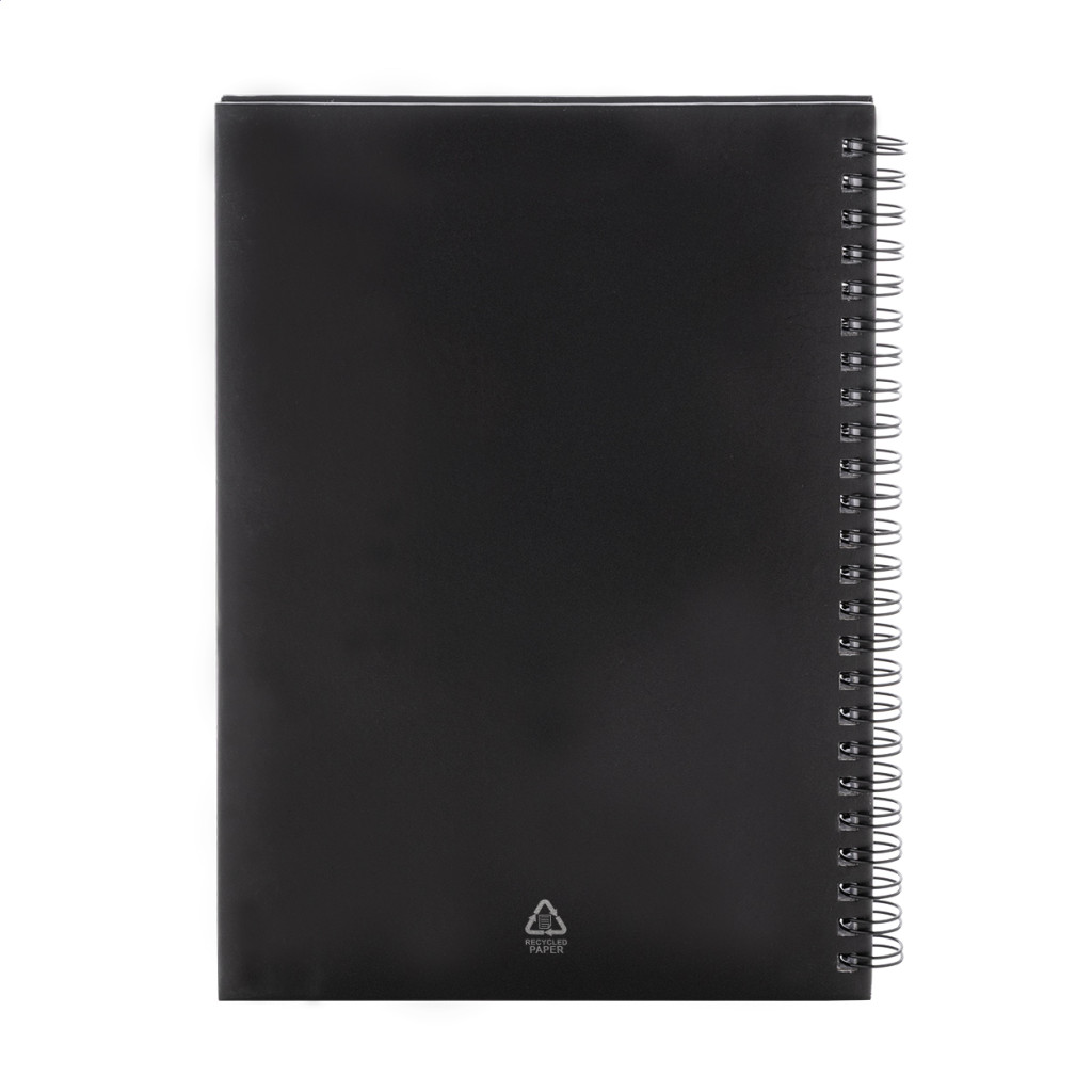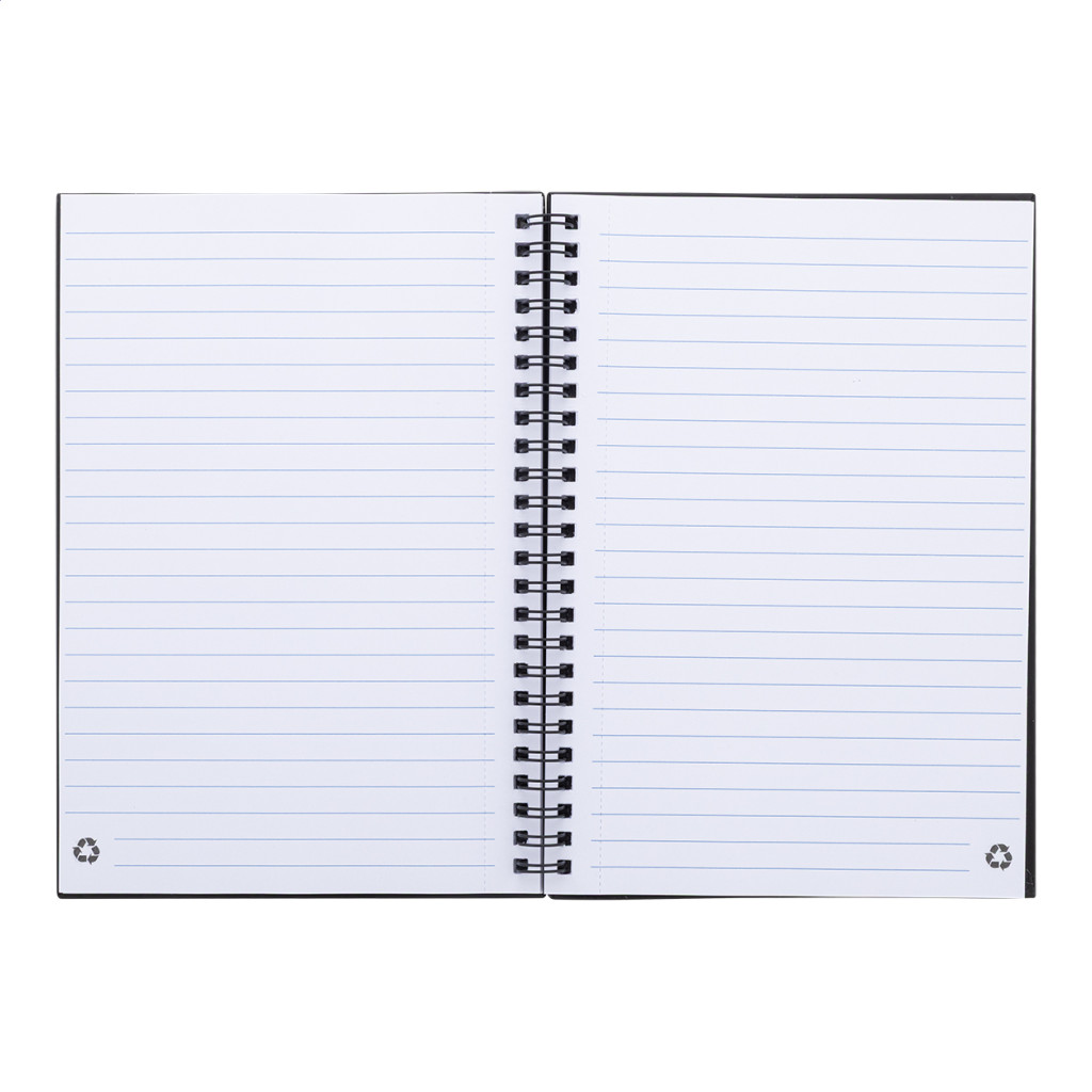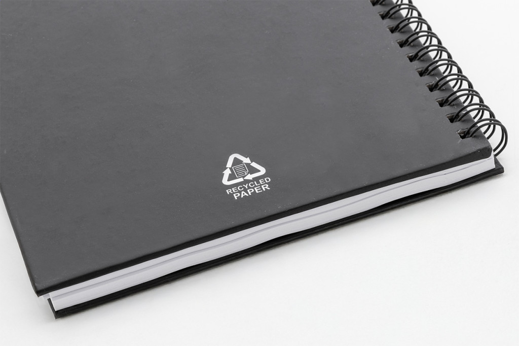 Újrahasznosított papír borítású spirál jegyzetfüzet 80 vonalas lappal, A5 méretű.