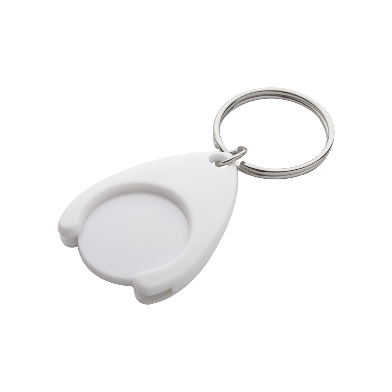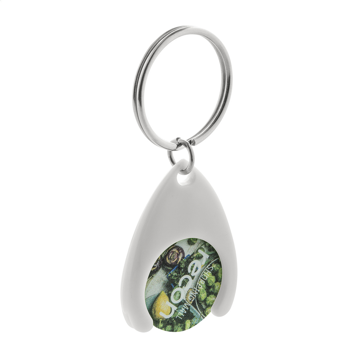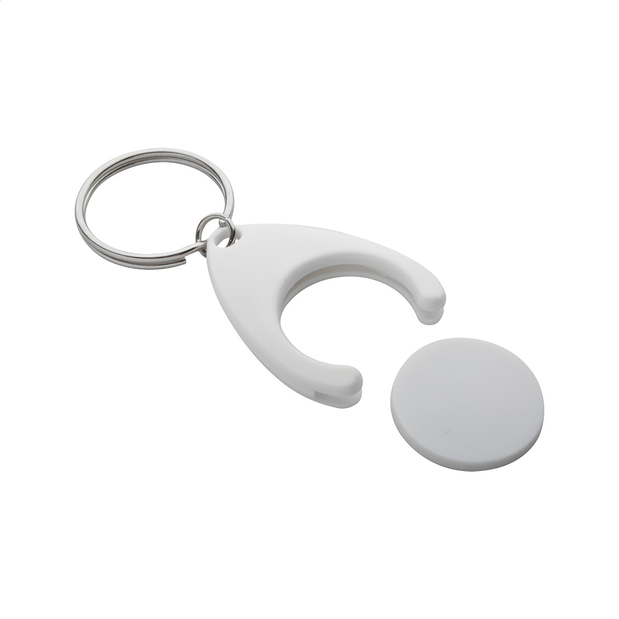 Műanyag bevásárlókocsi érme, fém kulcskarikával. Érme mérete: ø24×2 mm.