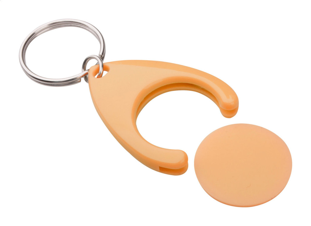 Műanyag bevásárlókocsi érme, fém kulcskarikával. Érme mérete: ø24×2 mm.