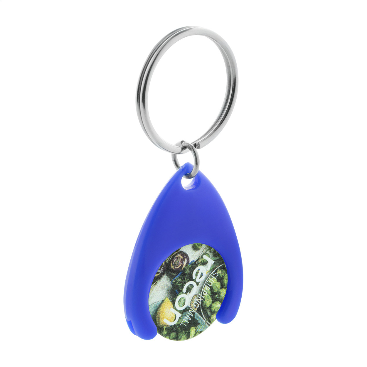 Műanyag bevásárlókocsi érme, fém kulcskarikával. Érme mérete: ø24×2 mm.