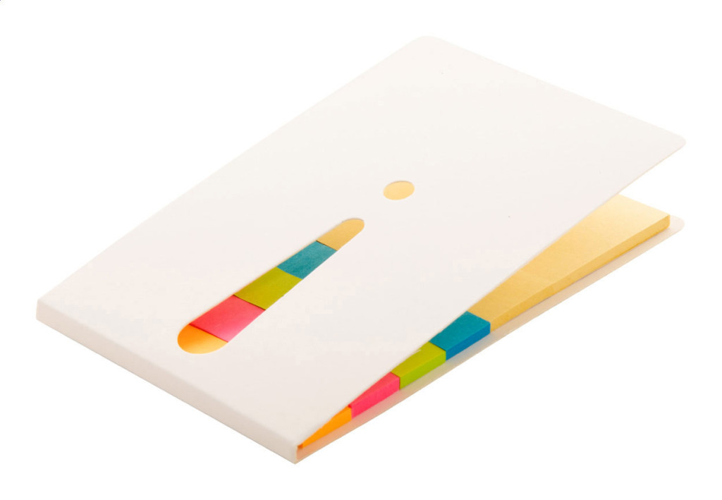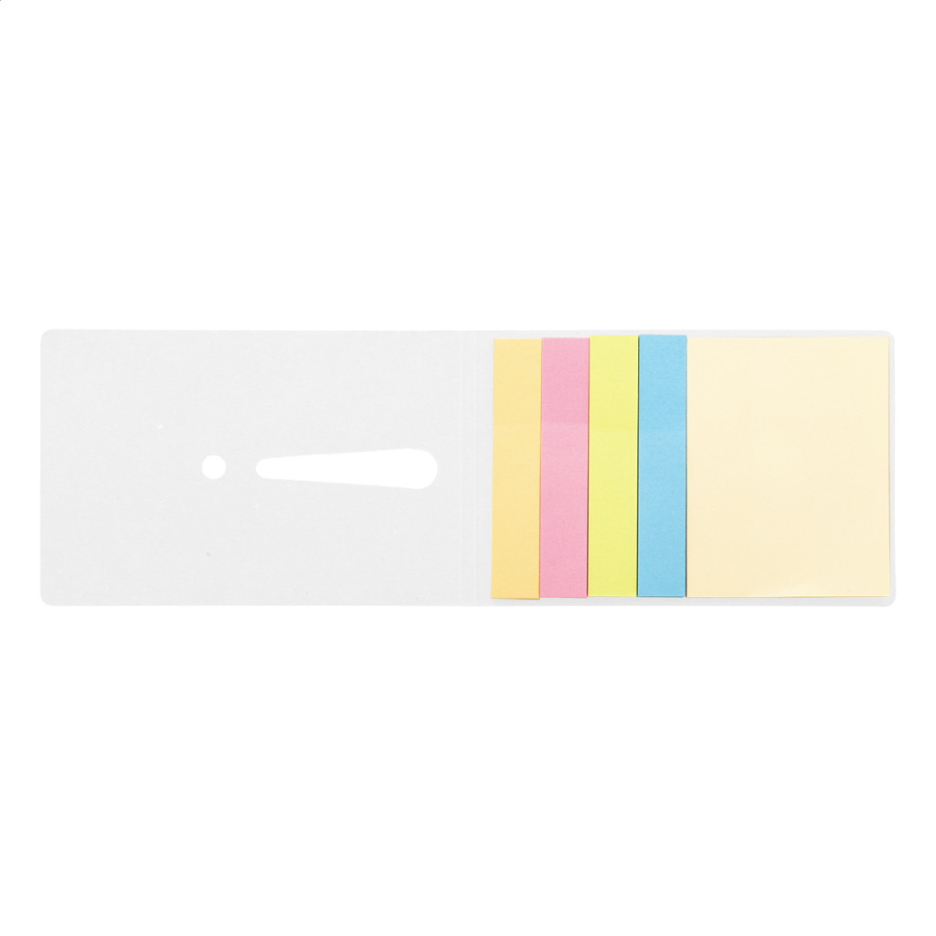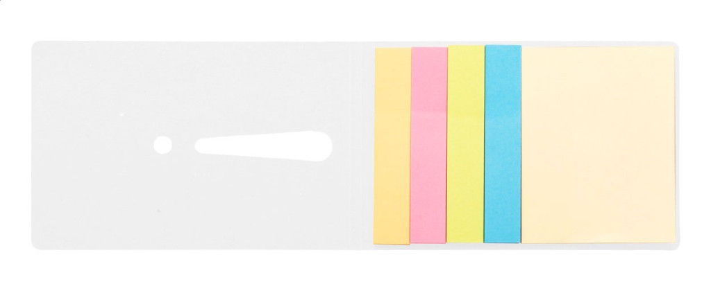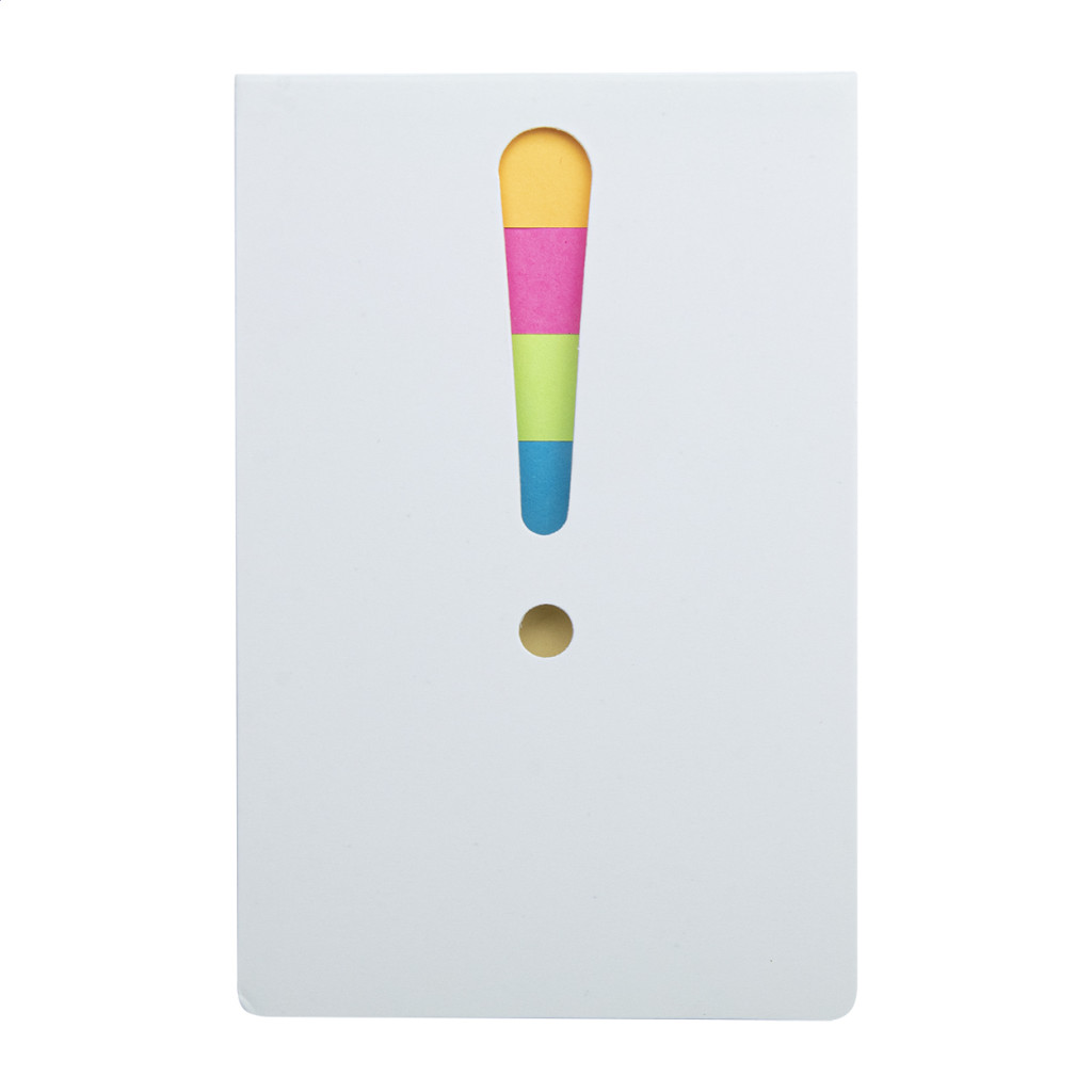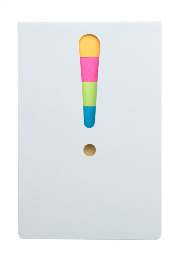 Öntapadós jegyzettömb 25 db nagy és 100 db kisebb lappal, 4 különböző színben. Kivágott fekiáltójellel a borítón.