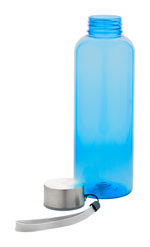 BPA-mentes RPET műanyag kulacs rozsdamentes acél kupakkal és hordszíjjal, 500 ml. Nem alkalmas szénsavas italok tárolására.