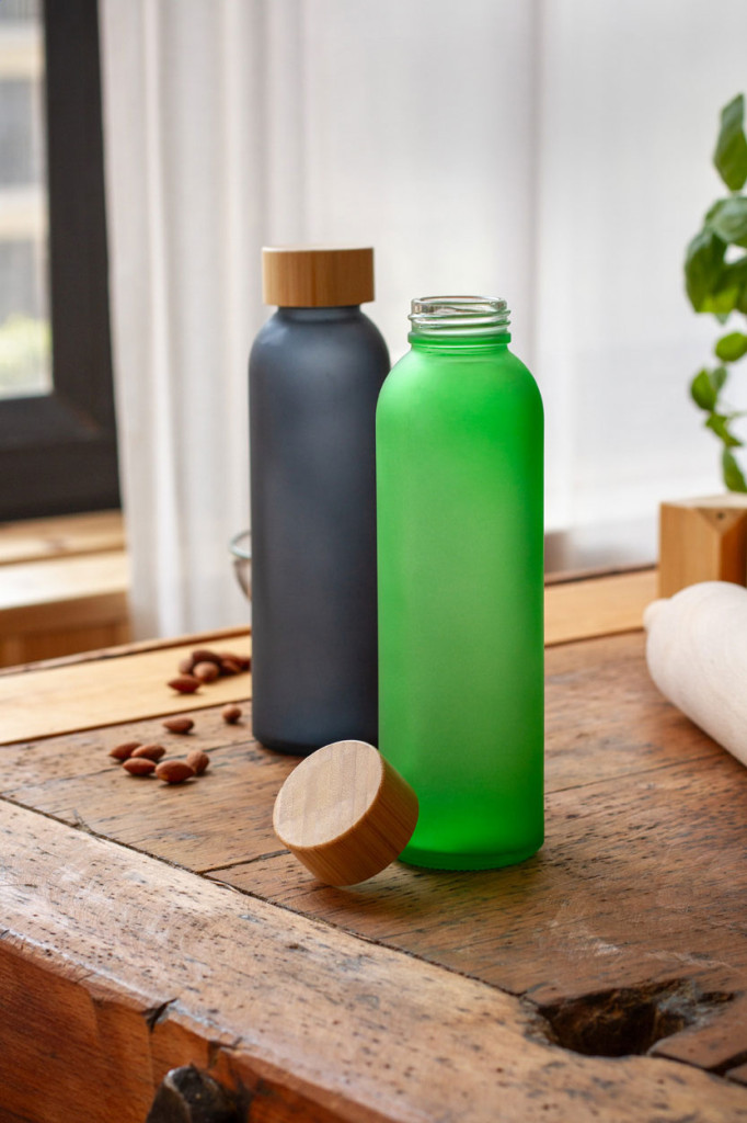 Homokfúvott üvegből készült kulacs bambusz tetővel, 500 ml. Nem alkalmas szénsavas italok tárolására.