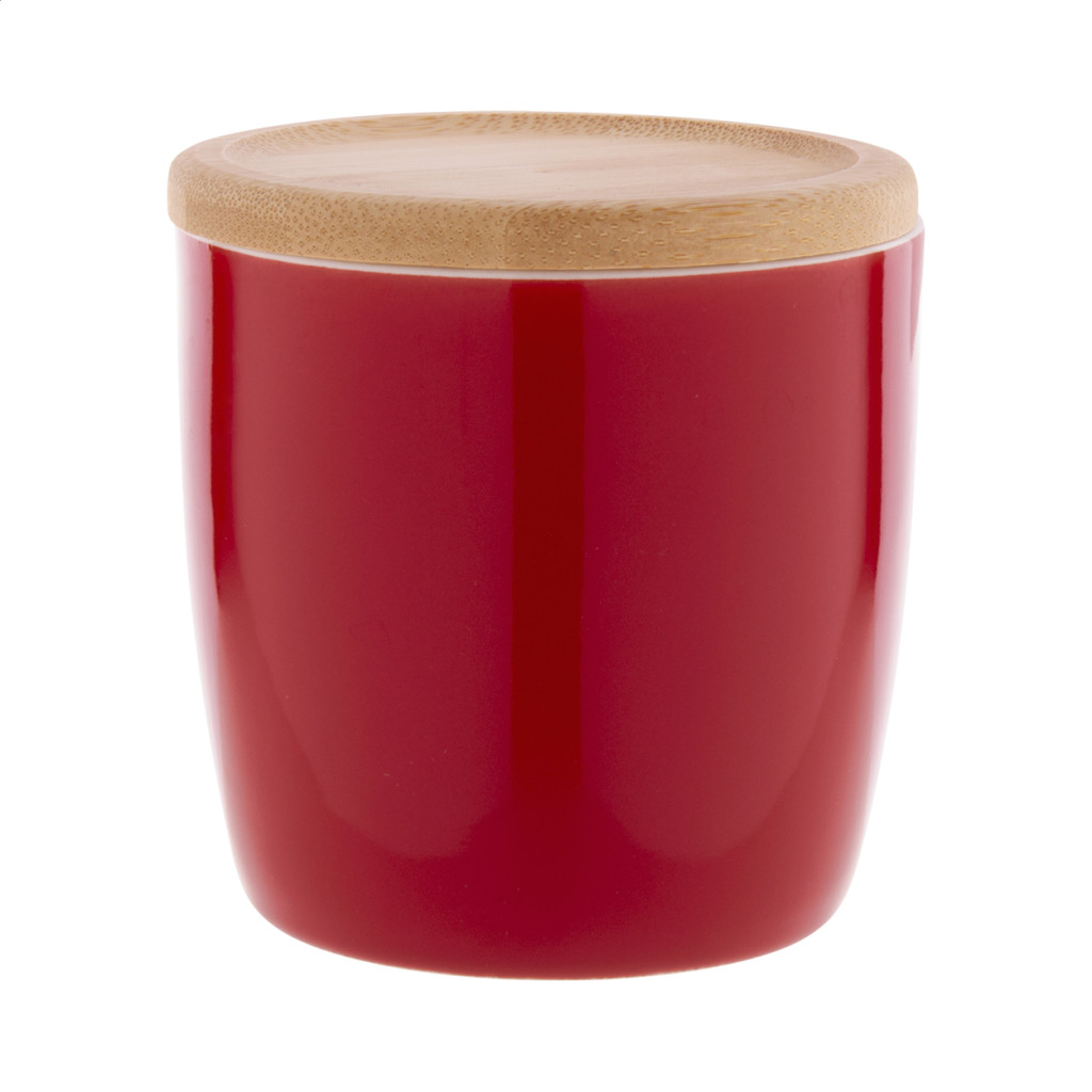 Magas minőségű színes kerámia bögre fehér belső résszel, bambusz alátéttel, 370 ml. Kraft papír dobozban szállítjuk.