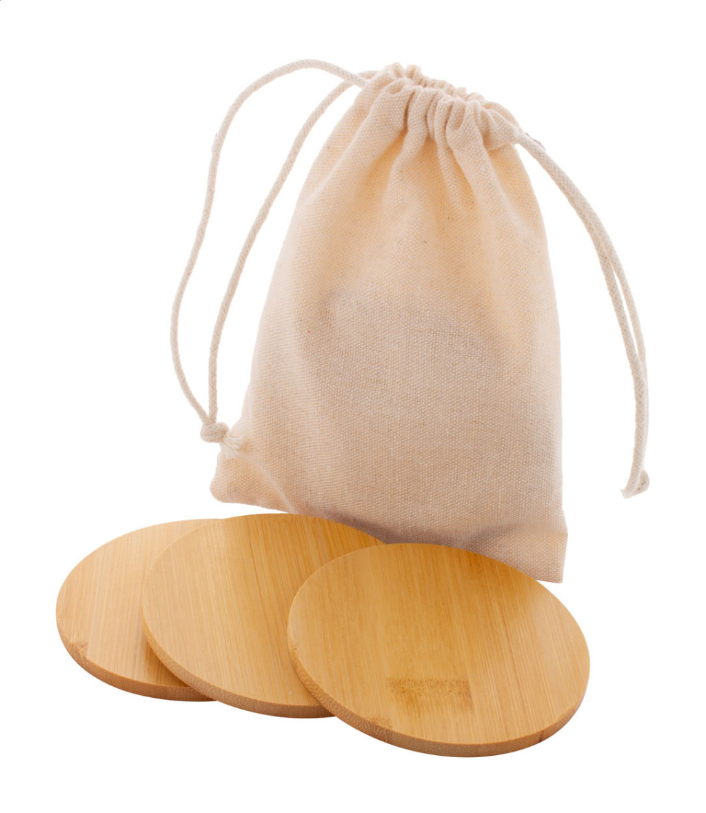 6 db-os kerek bambusz poháralátétszett zsinóros pamut tasakban.