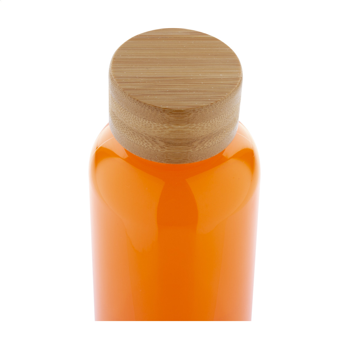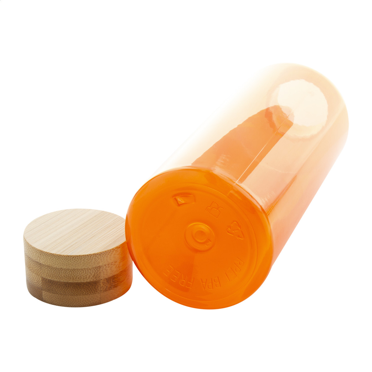BPA-mentes RPET műanyag kulacs bambusz kupakkal, 500 ml. Nem alkalmas szénsavas italok tárolására.