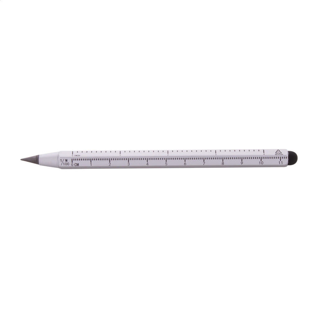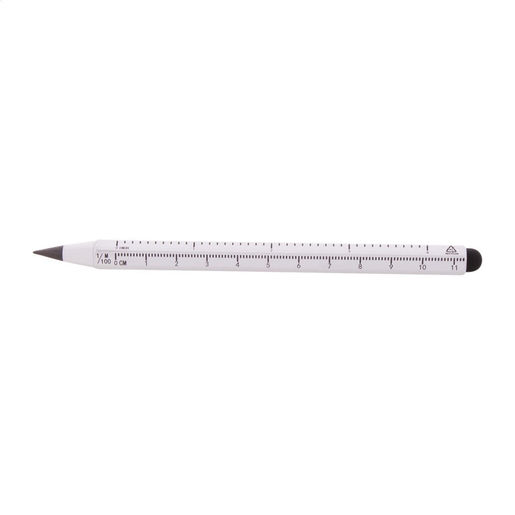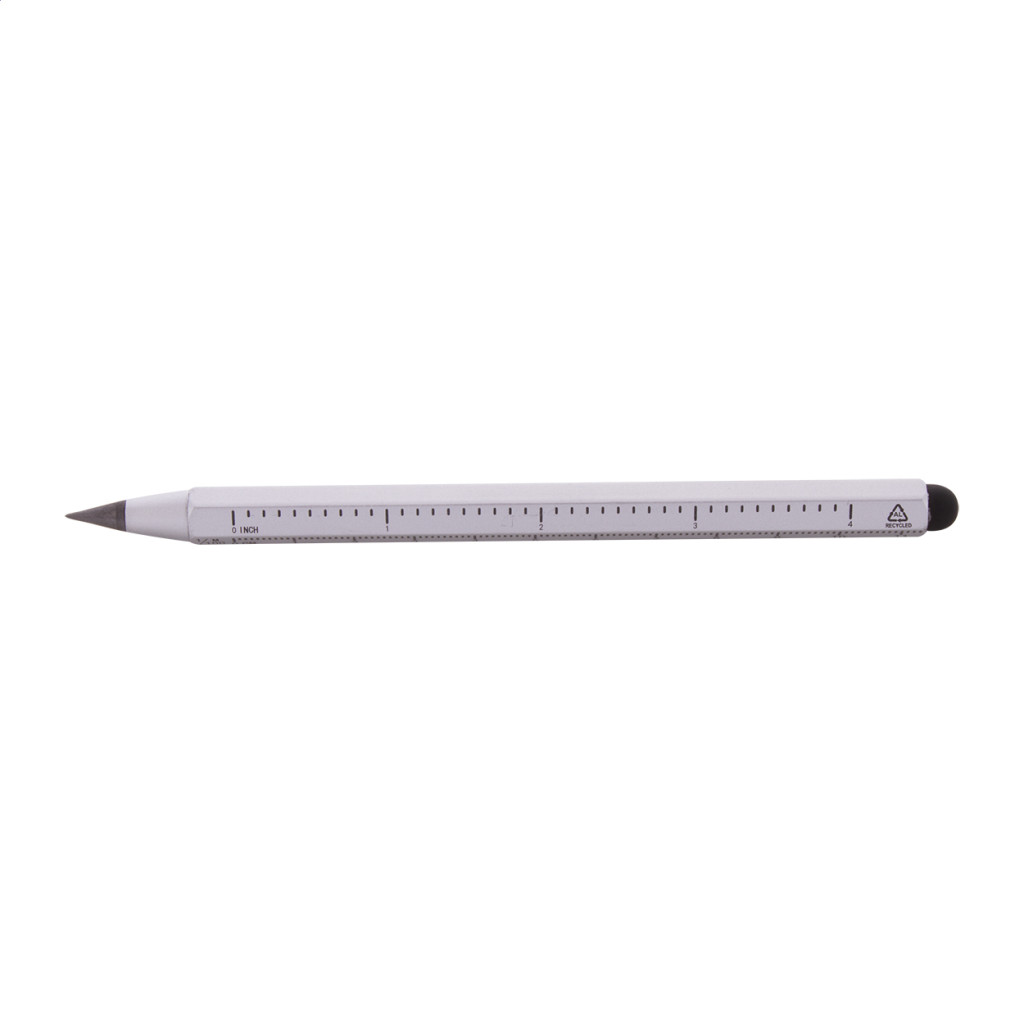 Újrahasznosított alumíniumból készült, hosszantartó tintamentes toll érintőképernyős gombbal és fémötvözet heggyel, amely oxidálja a papírt. Hatszögletű markolattal, 11 cm-es és 4 hüvelykes vonalzóval. Ez a toll egy ceruzához hasonlóan ír és radírozható.