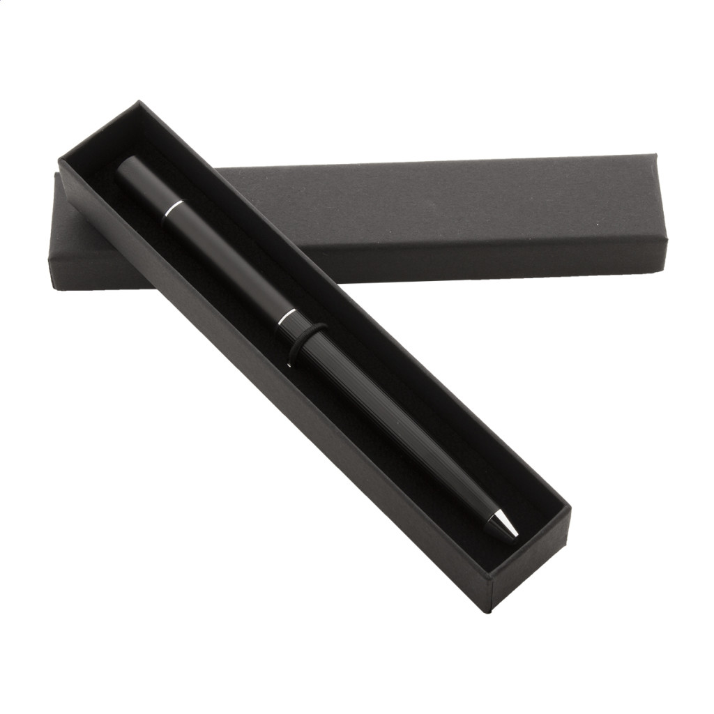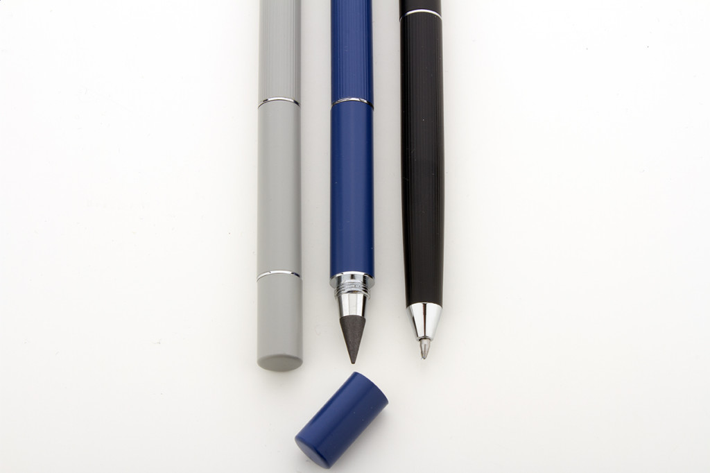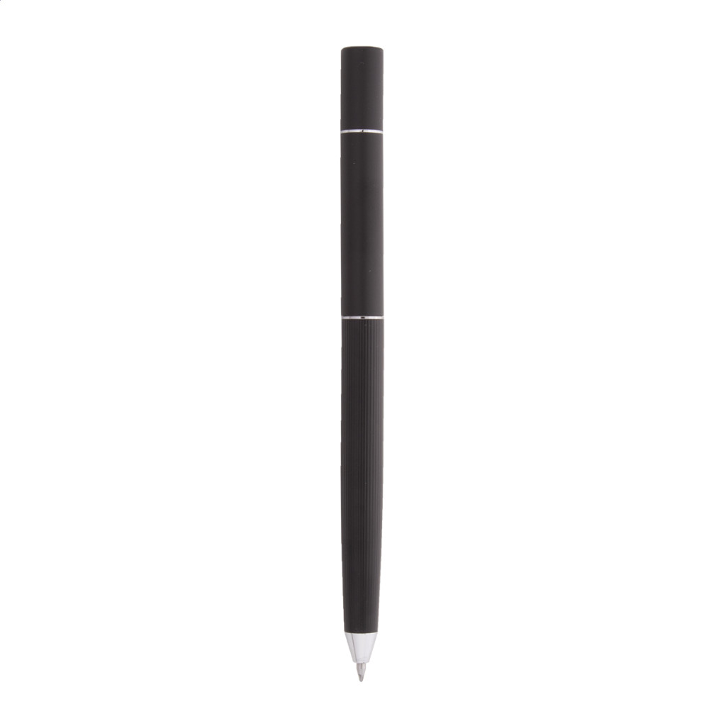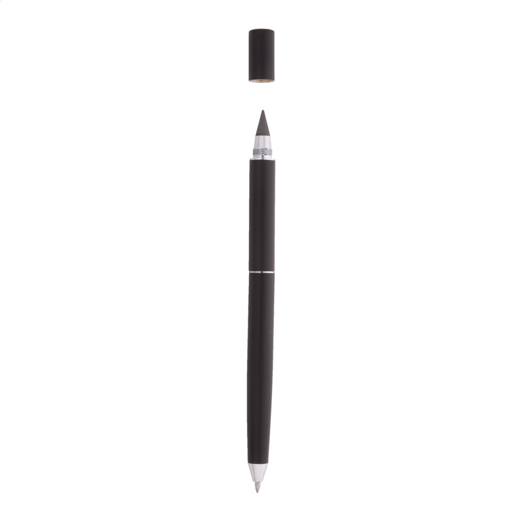 Többfunkciós fém toll. Egyik oldalán tekerős golyóstollal, kék tollbetéttel, másik oldalán tintamentes tollal és fémötvözet heggyel, amely oxidálja a papírt. Ez a toll a ceruzához hasonlóan ír, és radírozható is. Fekete díszdobozban szállítjuk.
