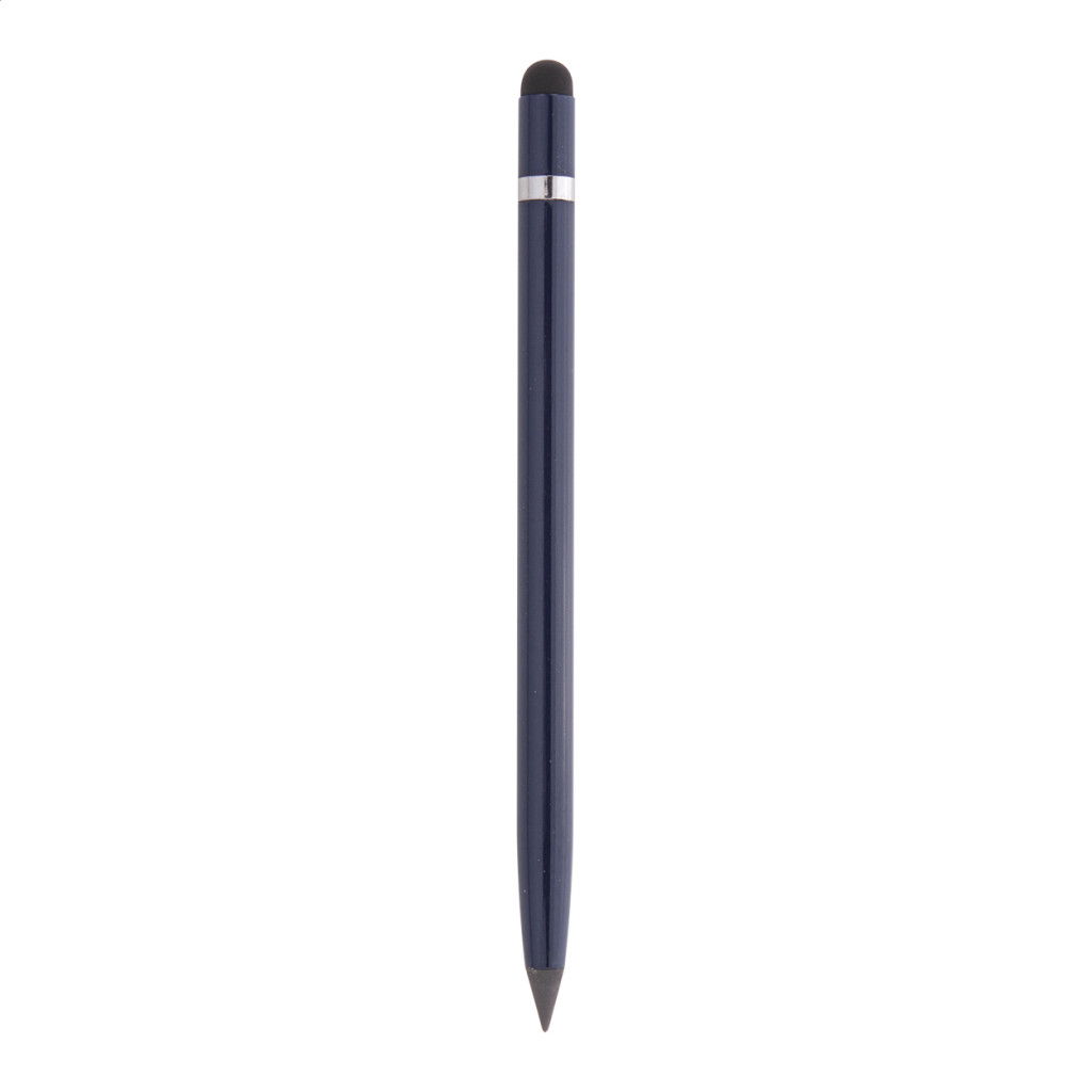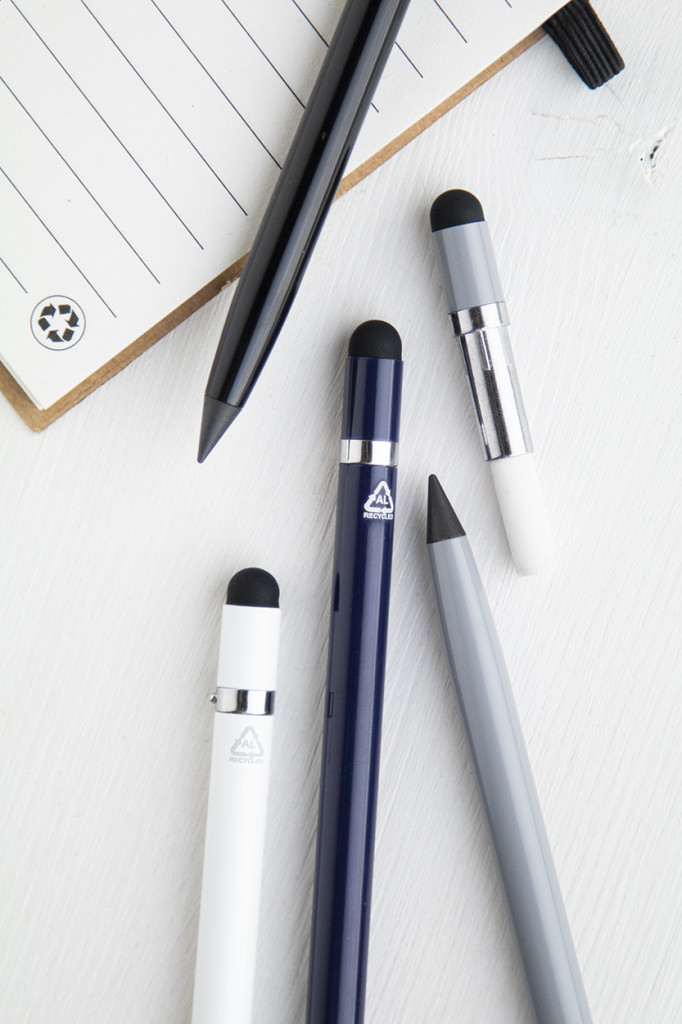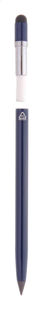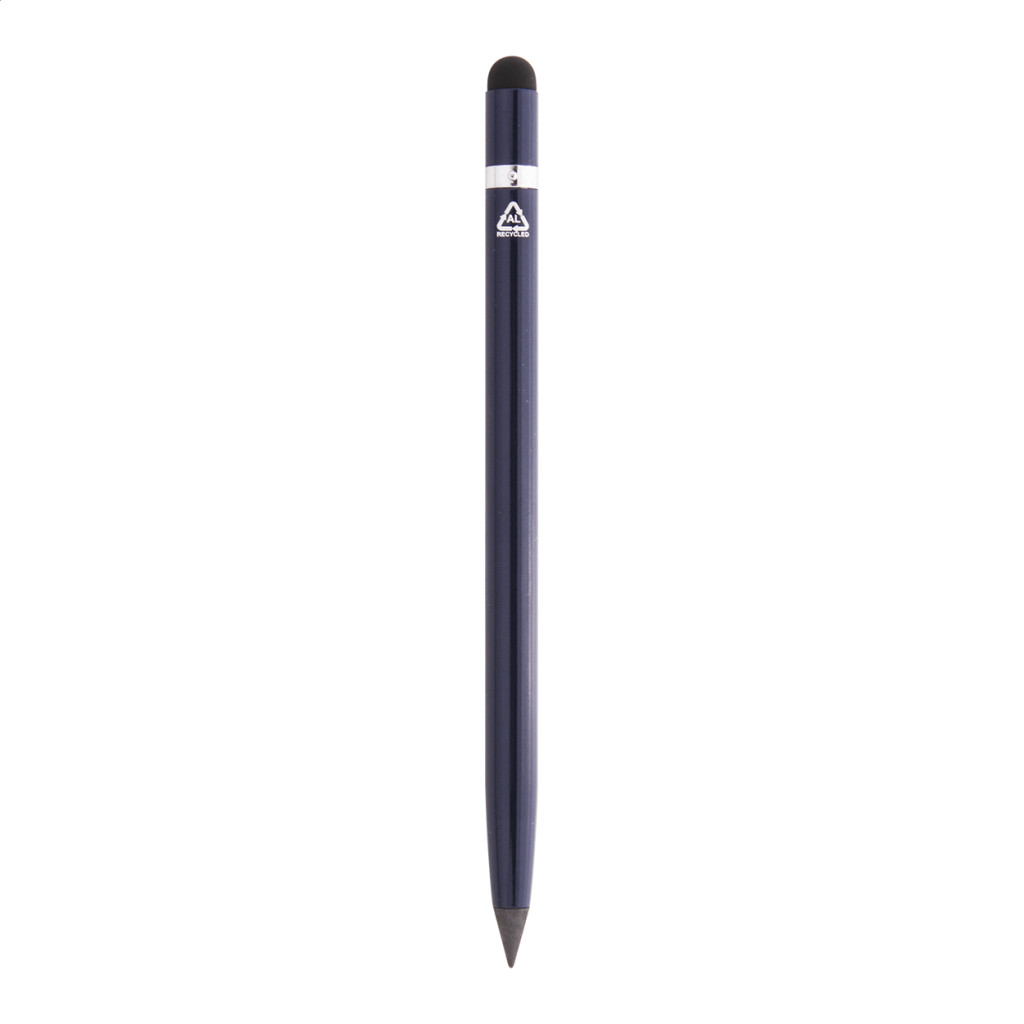 Újrahasznosított alumínium tintamentes toll fém heggyel, amely oxidálja a papírt. Ez a toll egy ceruzához hasonlóan ír és radírozható. Radírral ellátva.