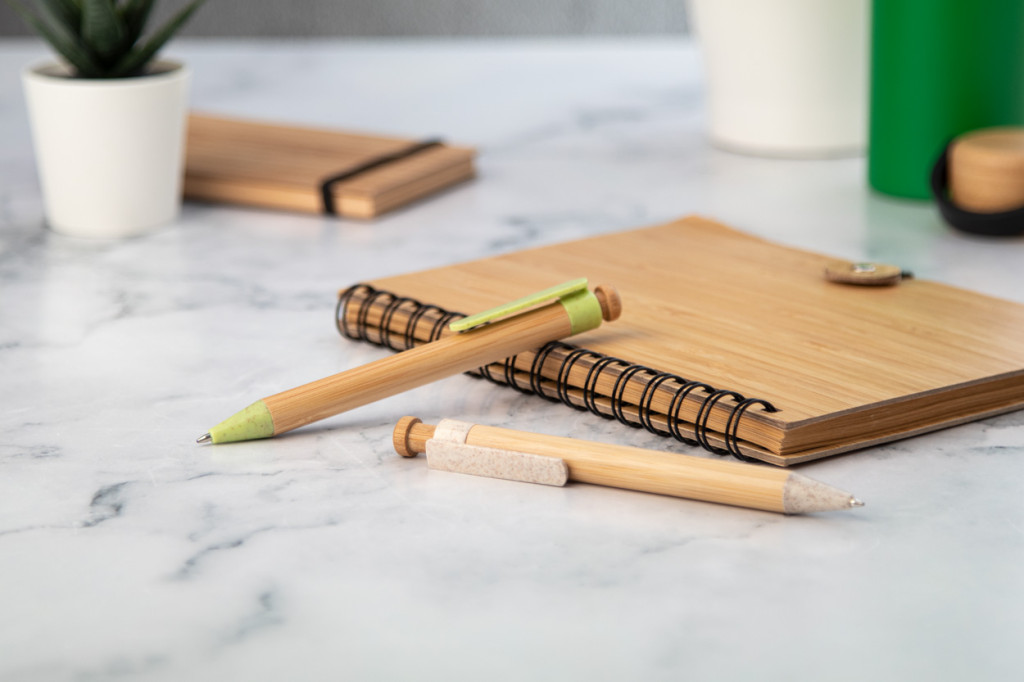 Bambusz golyóstoll búzaszalma műanyag részletekkel. Kék tollbetéttel szállítjuk.