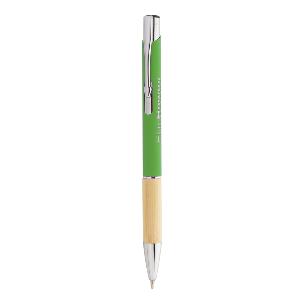 Alumínium golyóstoll bambusz markolattal, gumírozott felülettel és kék tollbetéttel. Speciális bevonattal rendelkezik, amely különlegesen fényessé teszi a gravírozott emblémát.