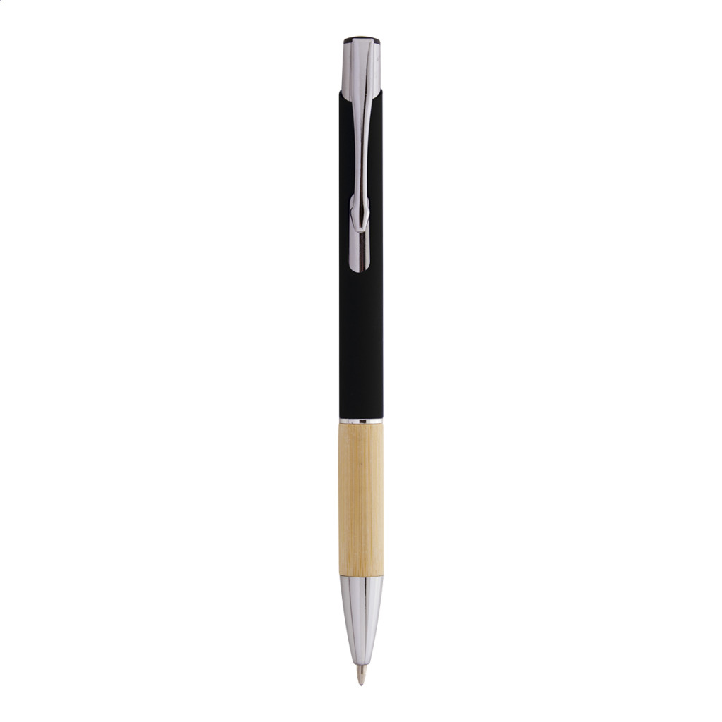 Alumínium golyóstoll bambusz markolattal, gumírozott felülettel és kék tollbetéttel. Speciális bevonattal rendelkezik, amely különlegesen fényessé teszi a gravírozott emblémát.