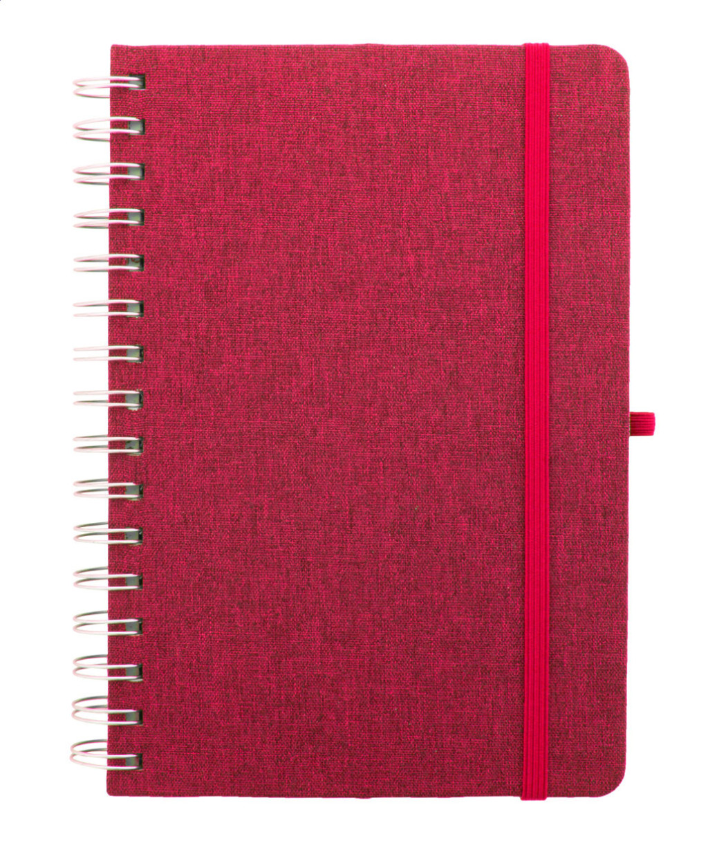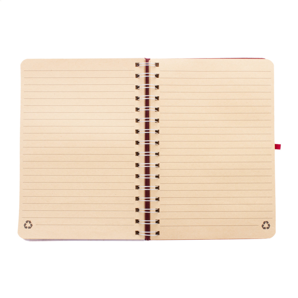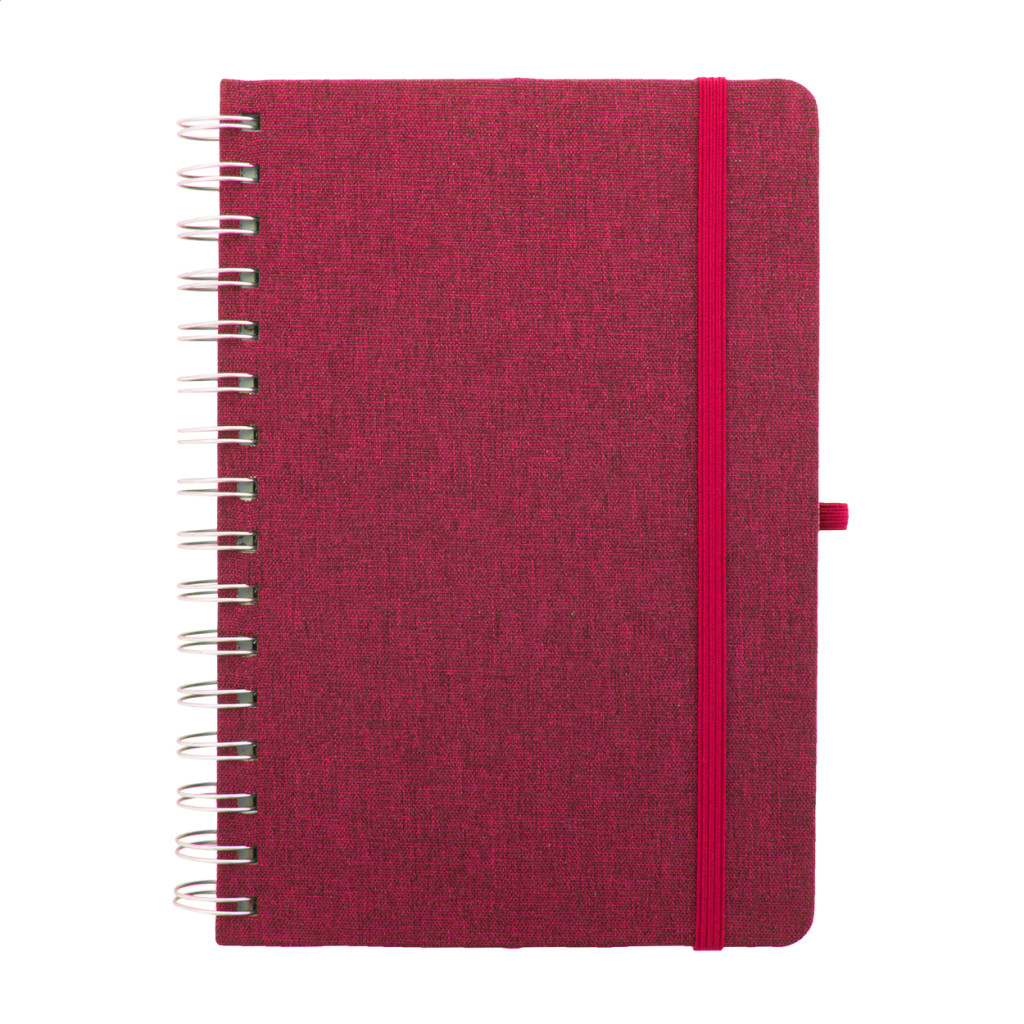 RPET poliészter borítású spirál jegyzetfüzet, búzaszalma műanyag telefon- és tablettartó betéttel. 70 újrahasznosított kraft papírból készült vonalas lappal, gumis pánttal és tolltartóval. A5 méretű.